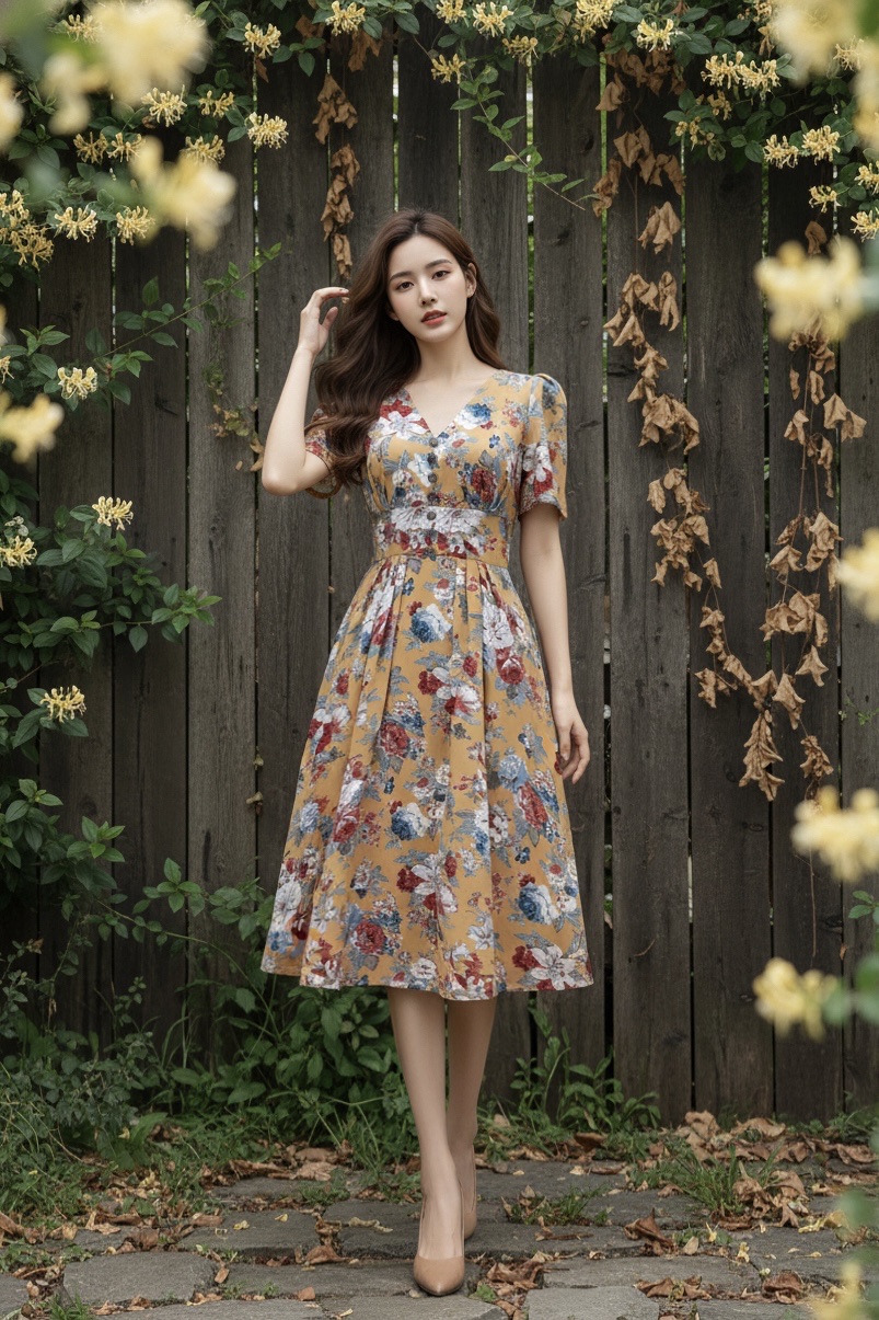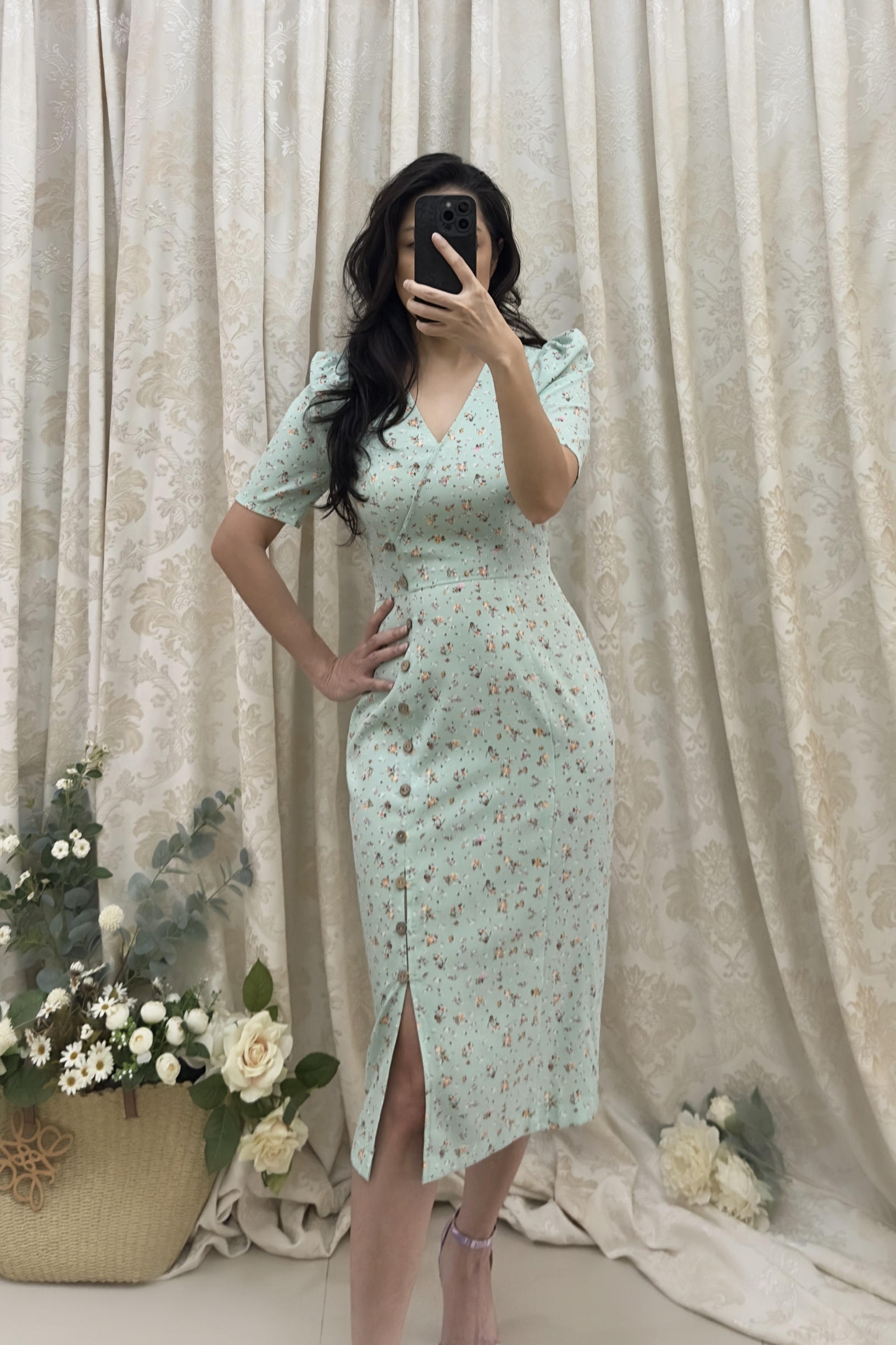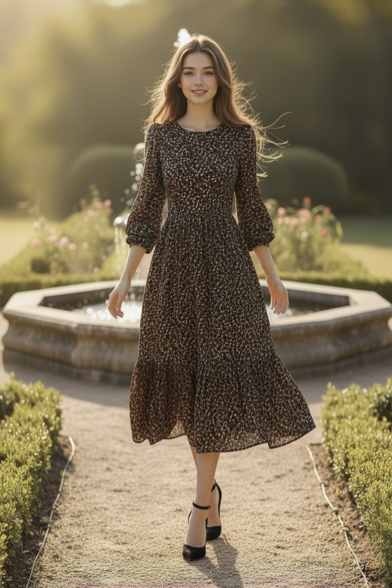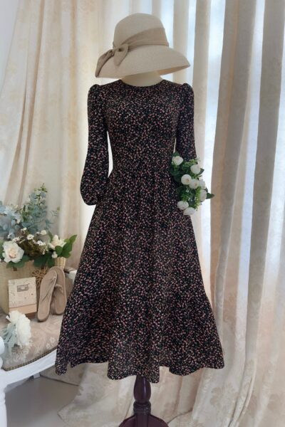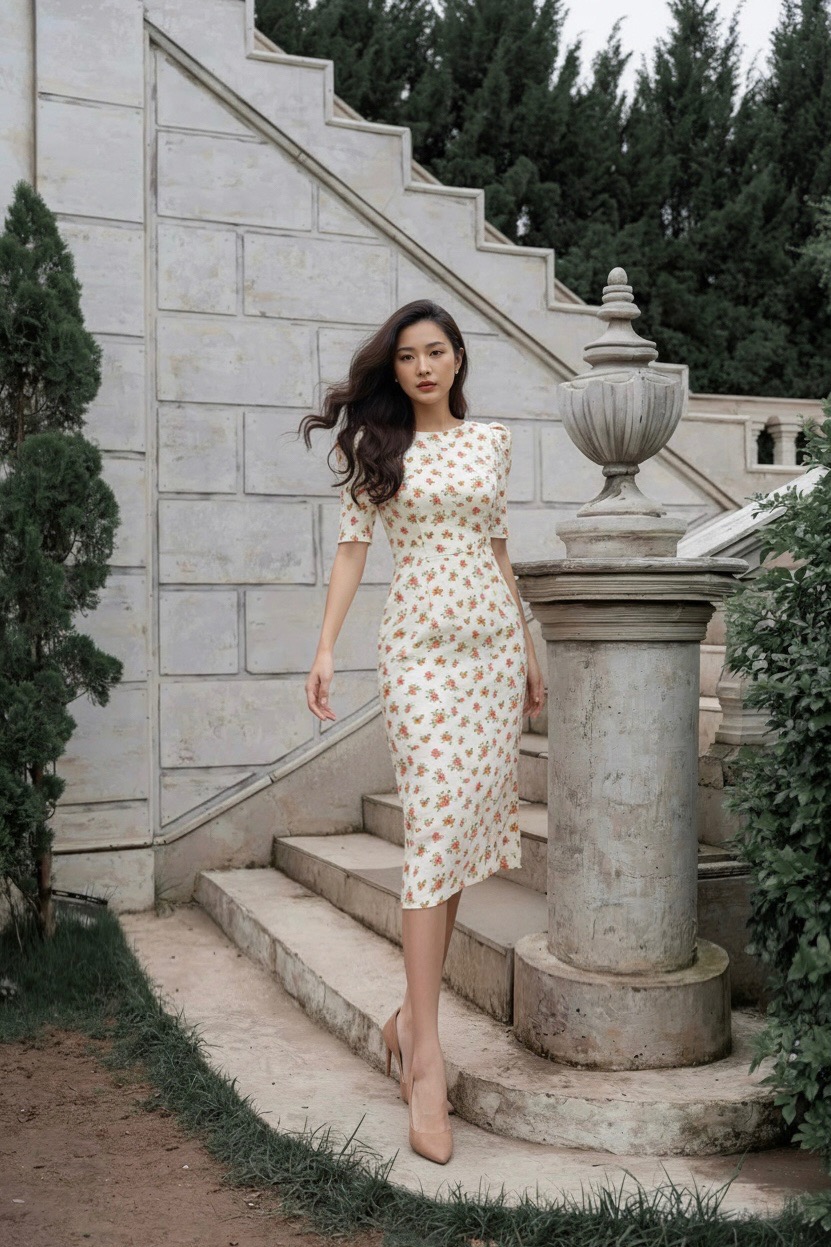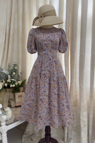 Đầm midi cổ tròn tay phồng, tùng cao-thấp phối bèo đuôi cá.