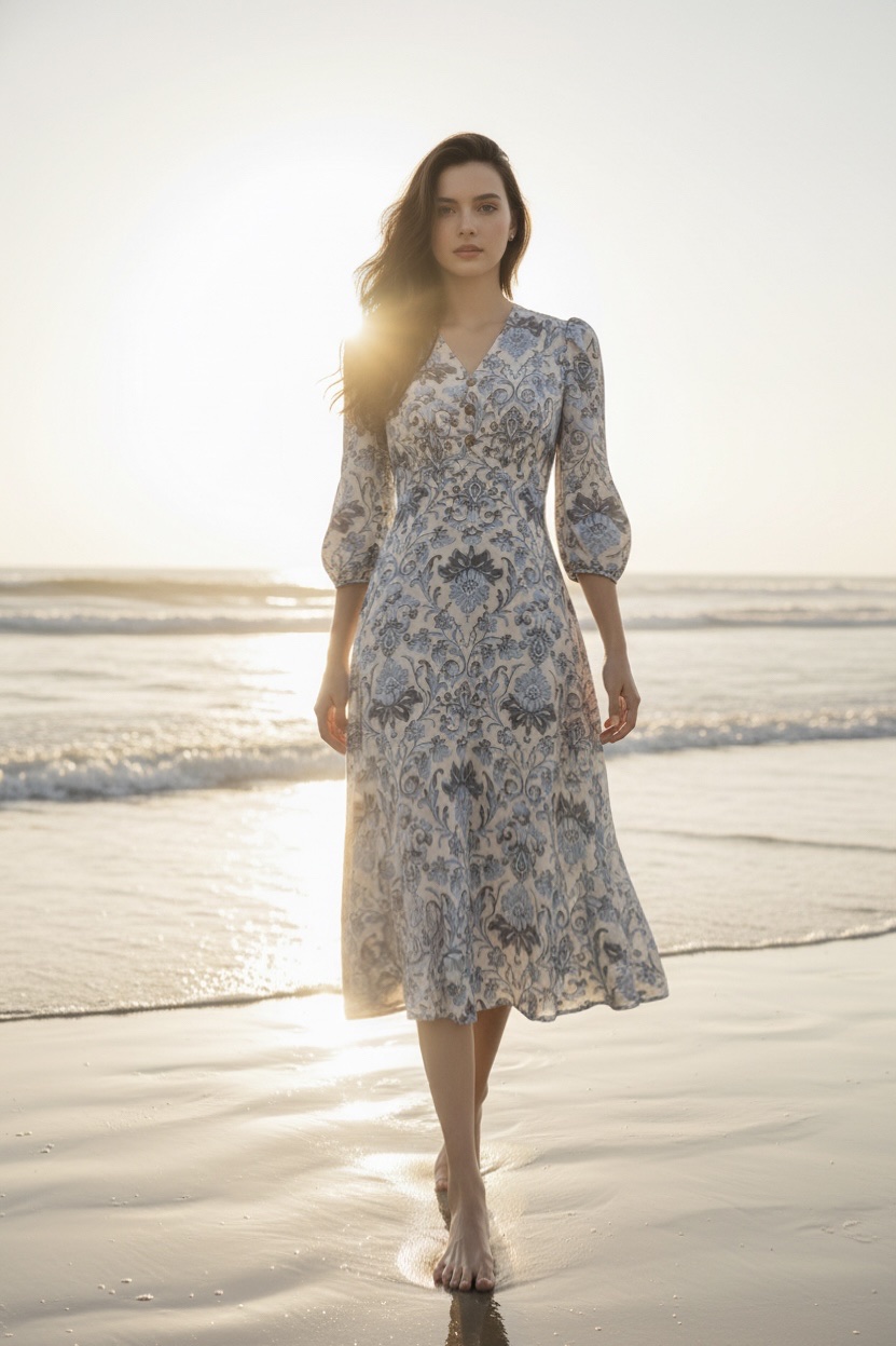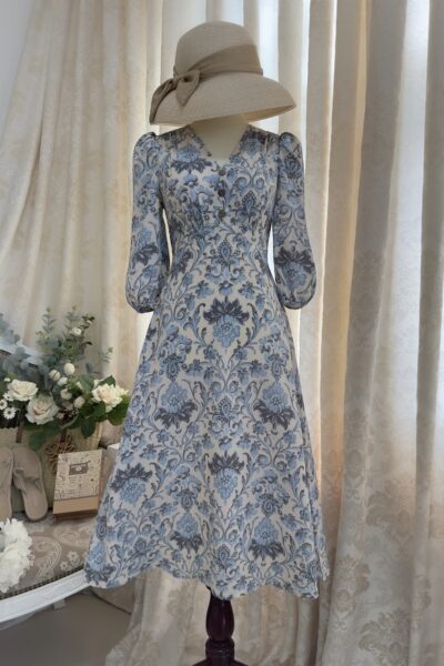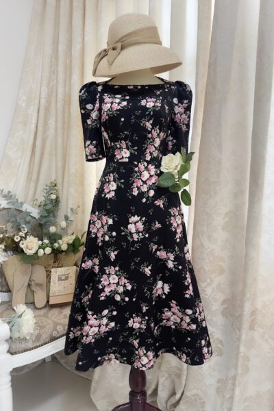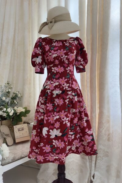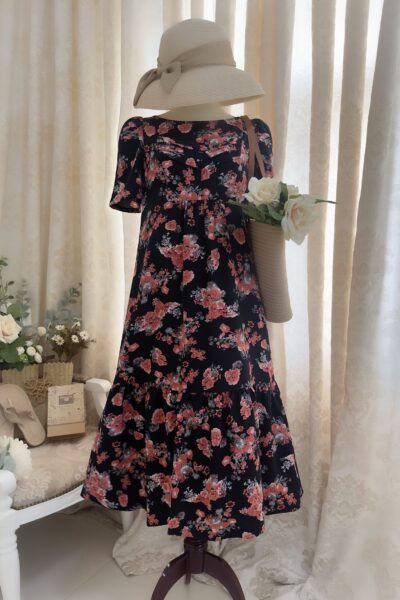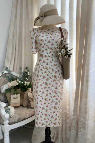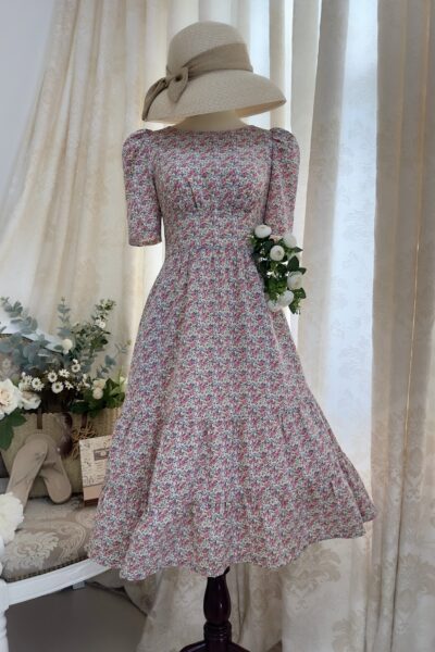 Đầm Midi dáng dài cổ tim, vai chồm, eo cao, lưng có thun, tùng A.