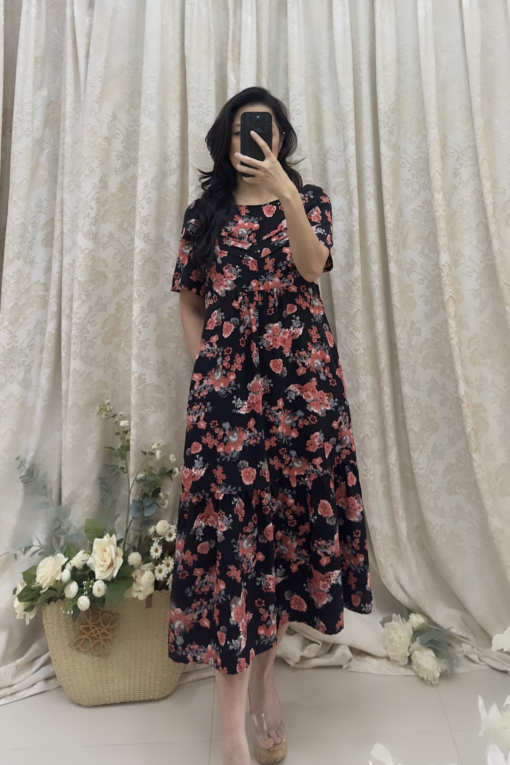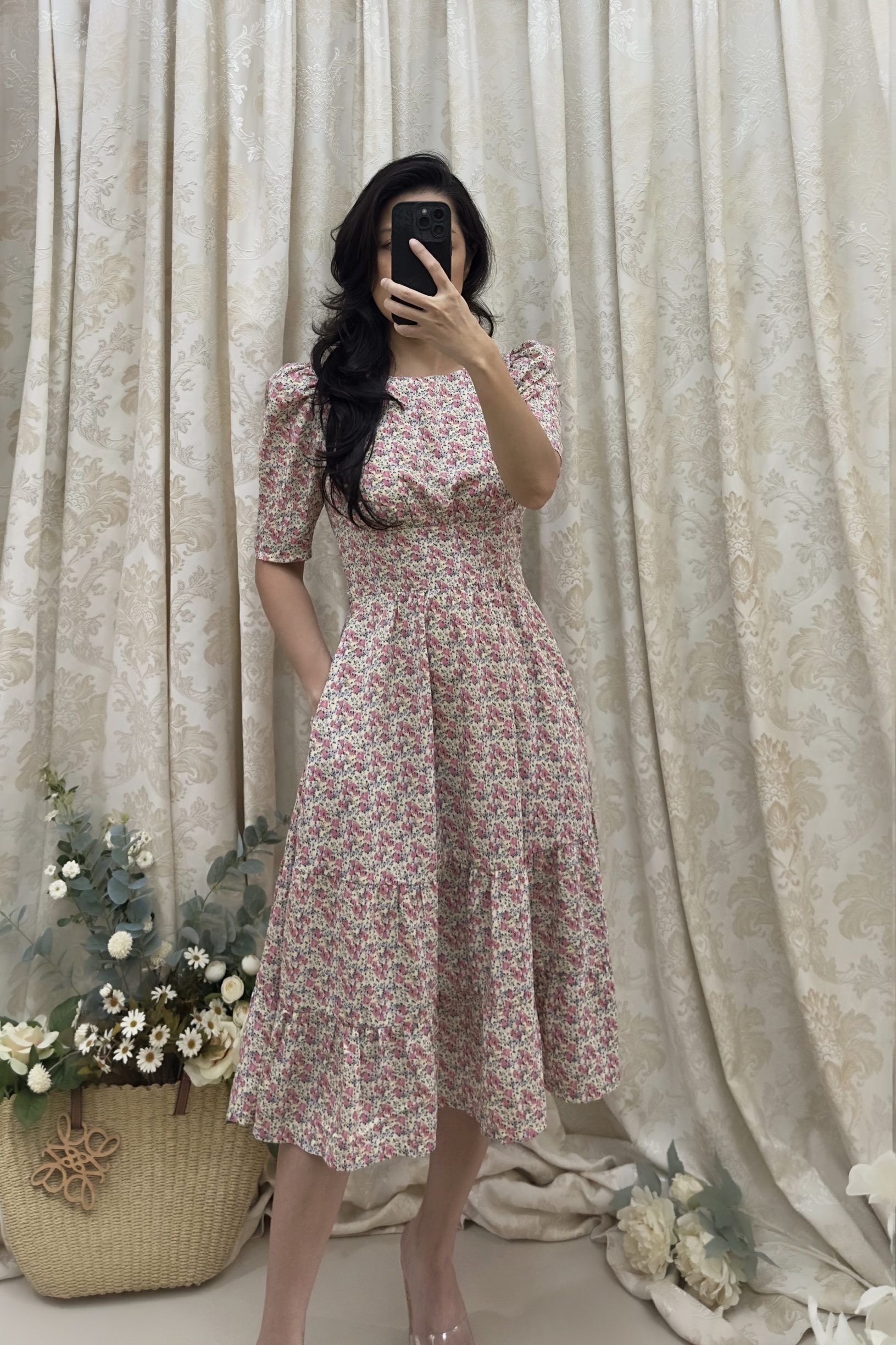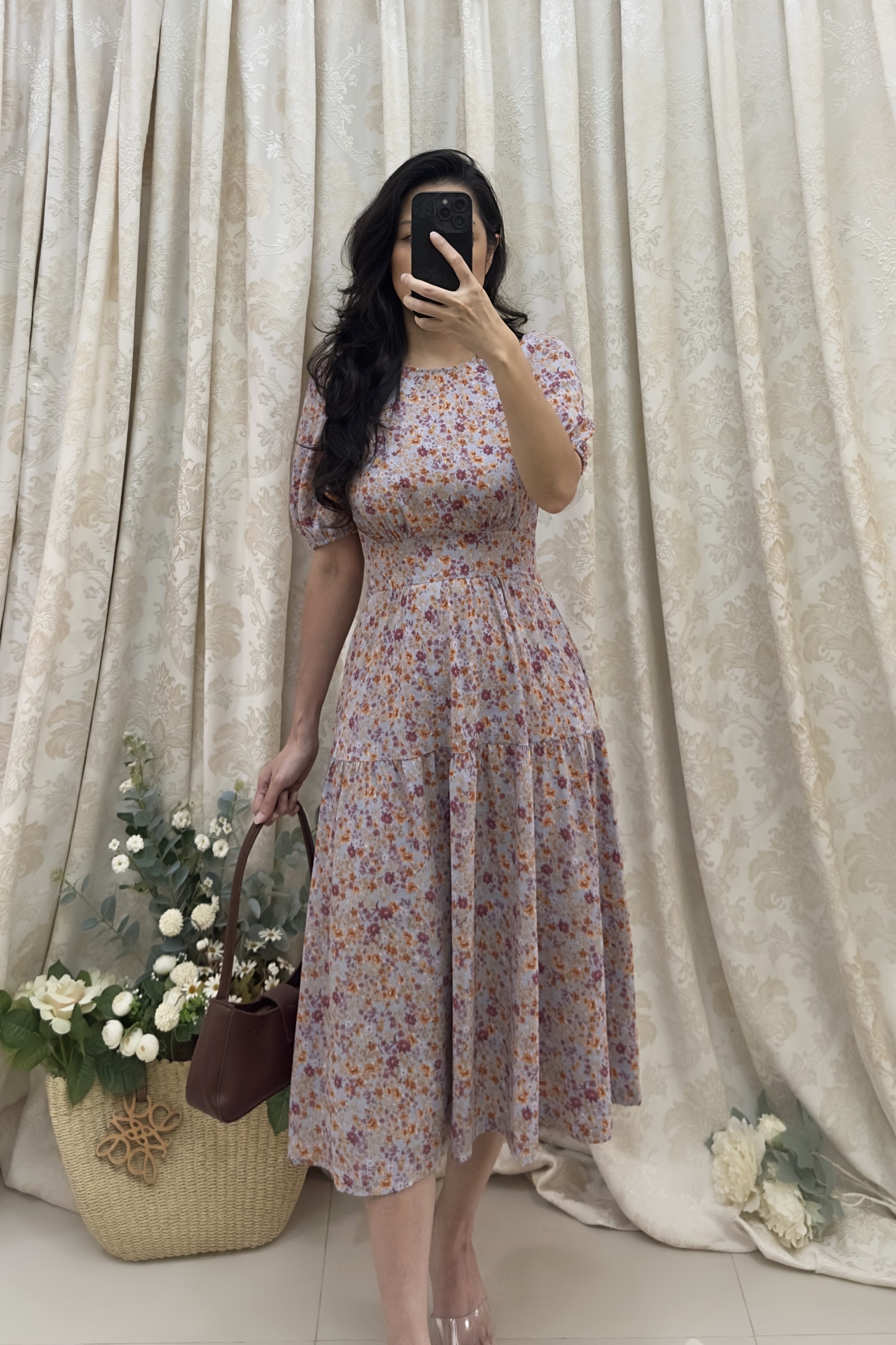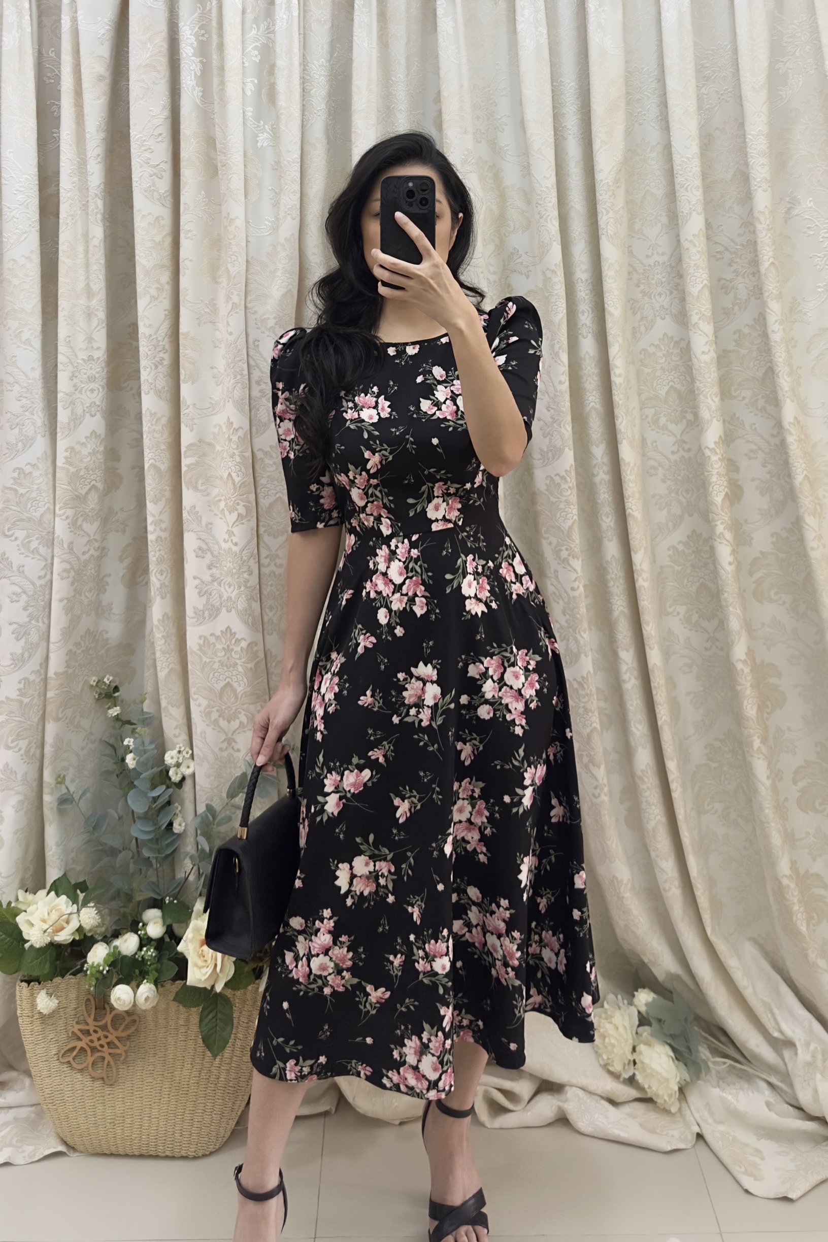 Đầm Midi cổ tròn tay phồng eo thun nối hông, tùng phối tầng.