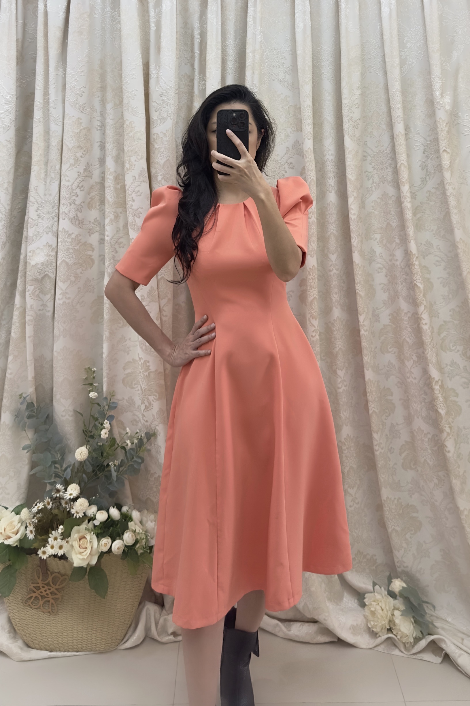 Đầm midi cổ tròn xếp pli, tay phồng, tùng 8 mảnh.
