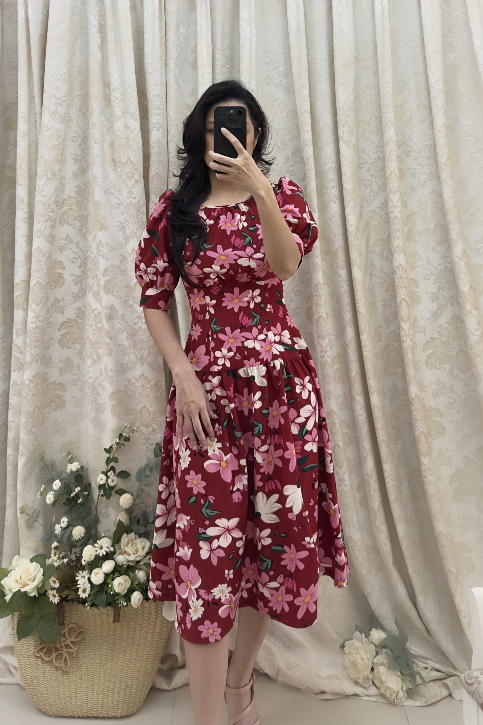 Đầm Midi cổ tim tay phồng xếp pli ngực eo thun