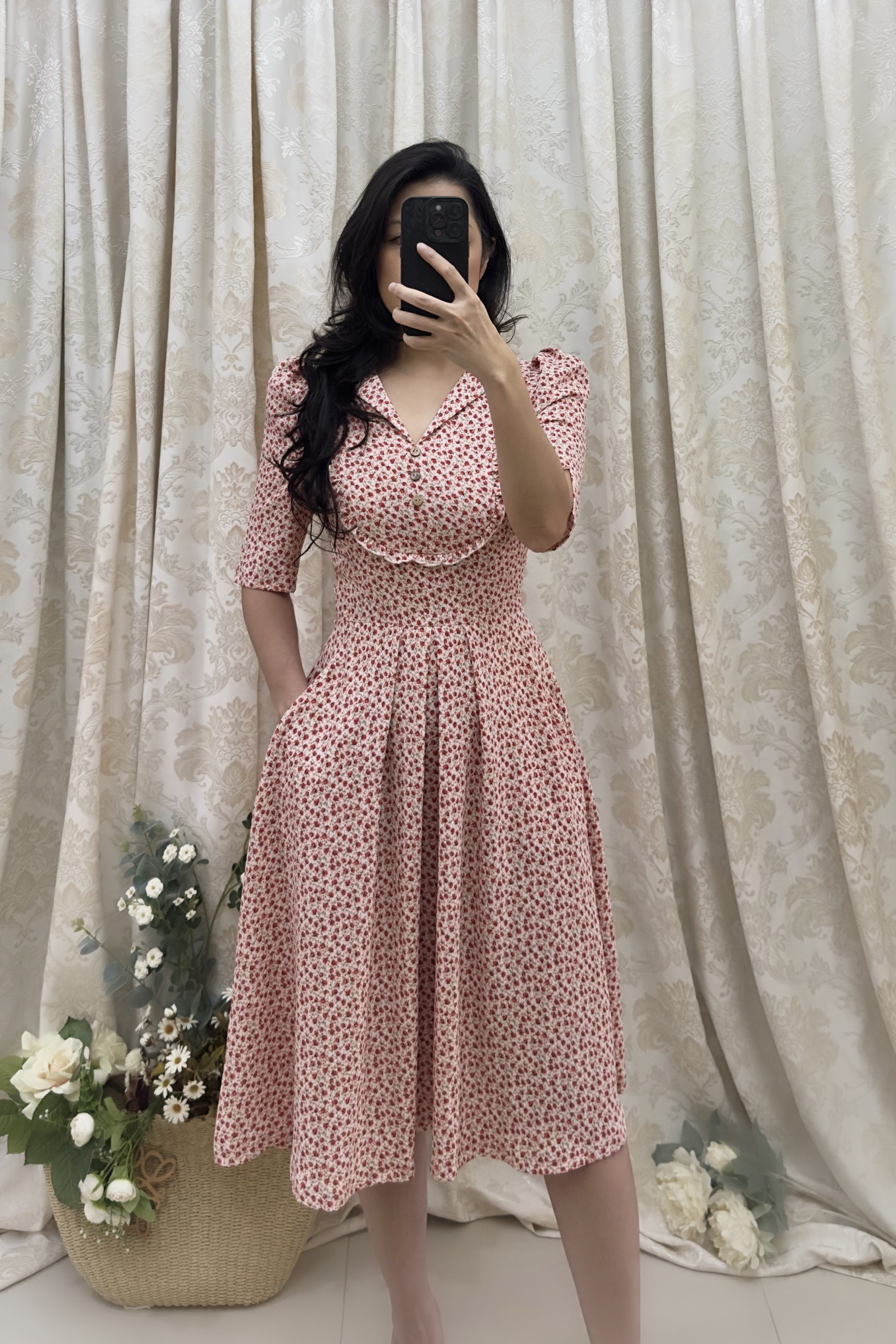 Đầm Midi cổ tròn tay phồng eo cao, thun eo sau, phối bèo lai.