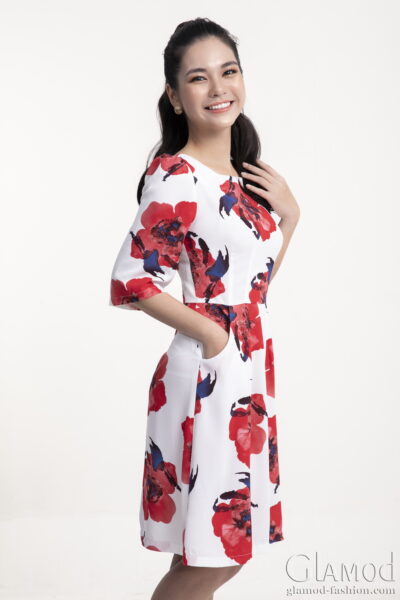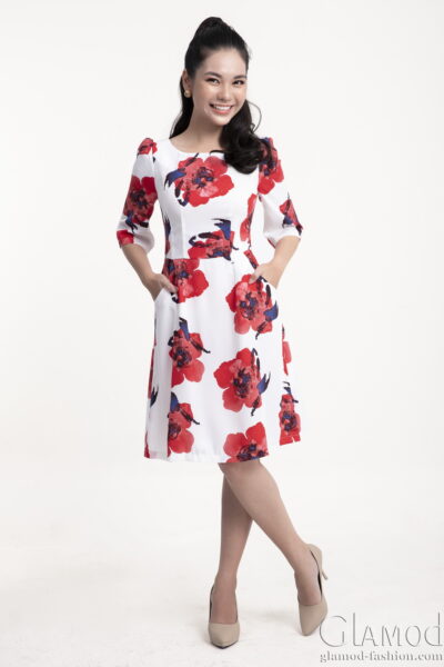 Đầm Midi cổ v tay phồng nối chân ngực, tùng xếp pli.