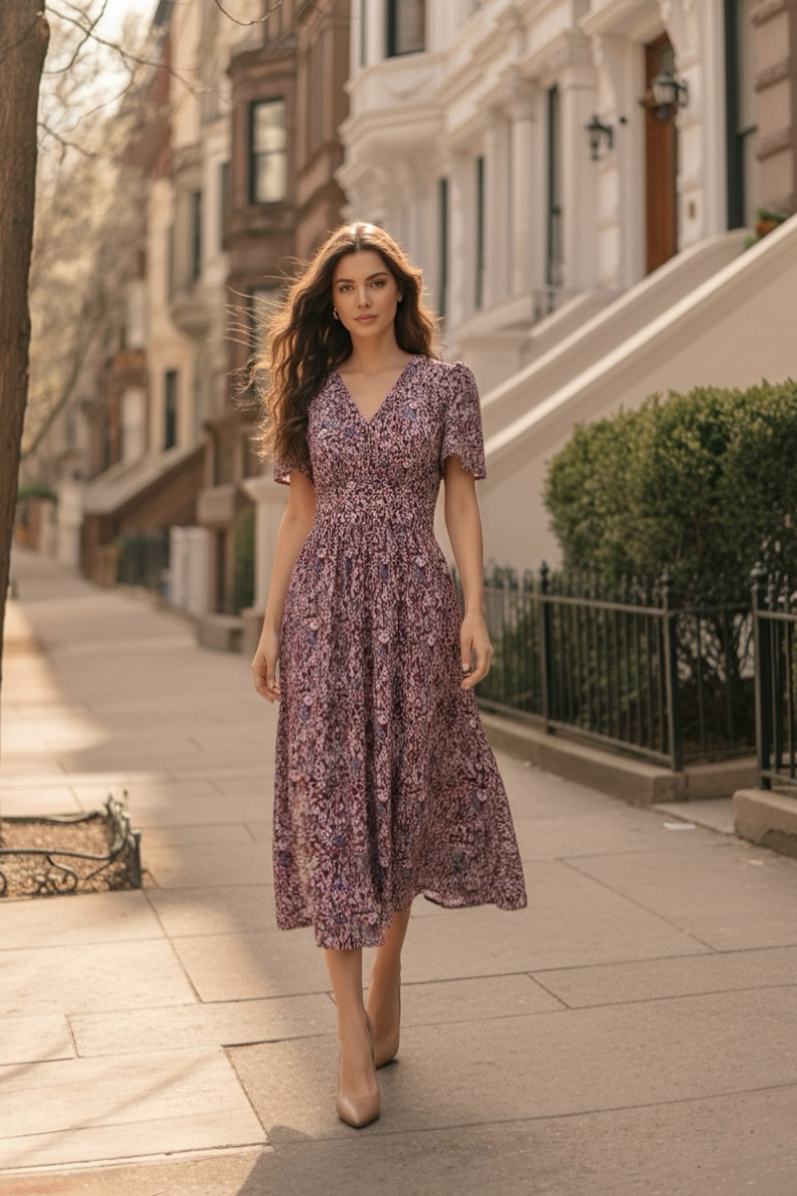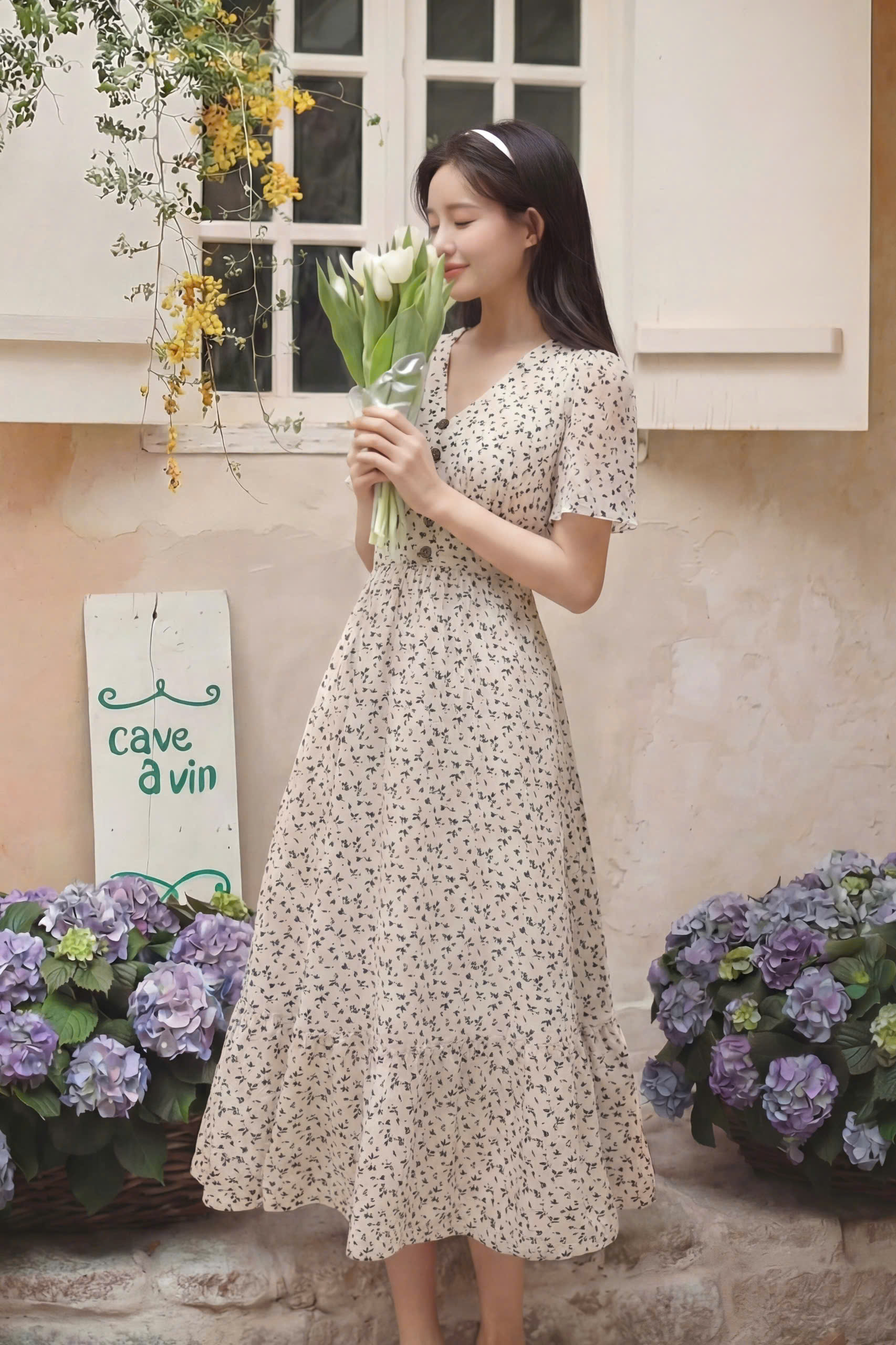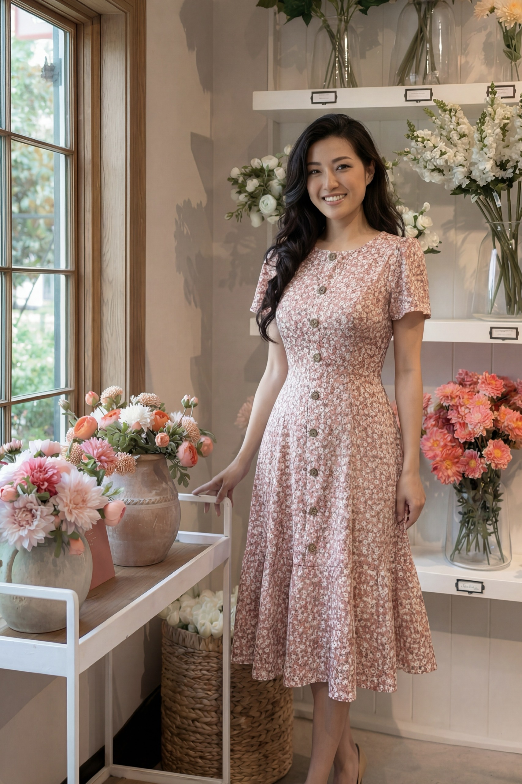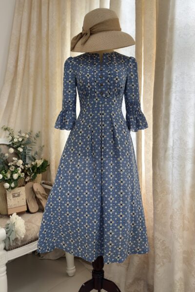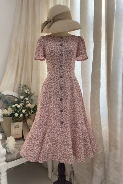 Đầm Midi dáng dài cổ tim, vai chồm, eo cao, lưng có thun, tùng A.