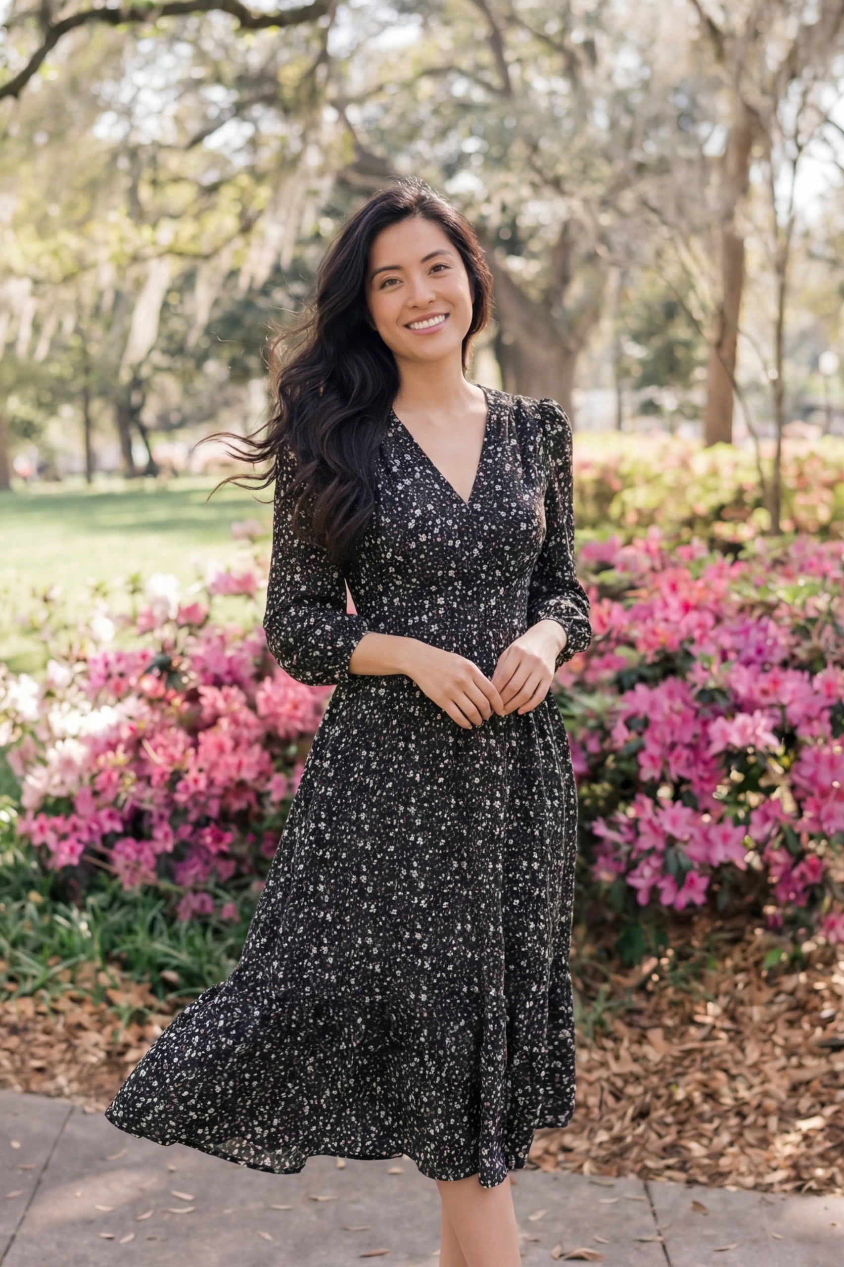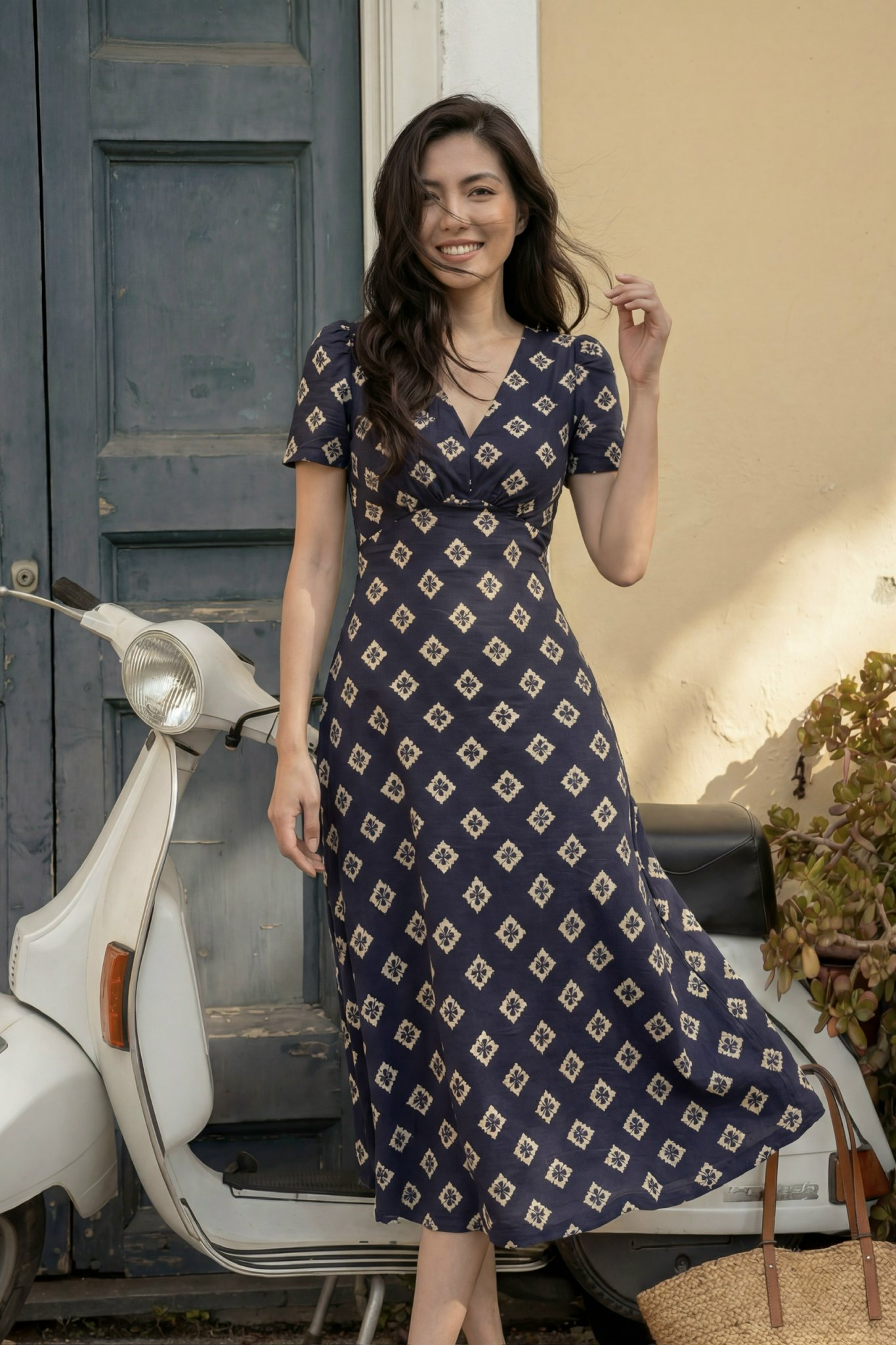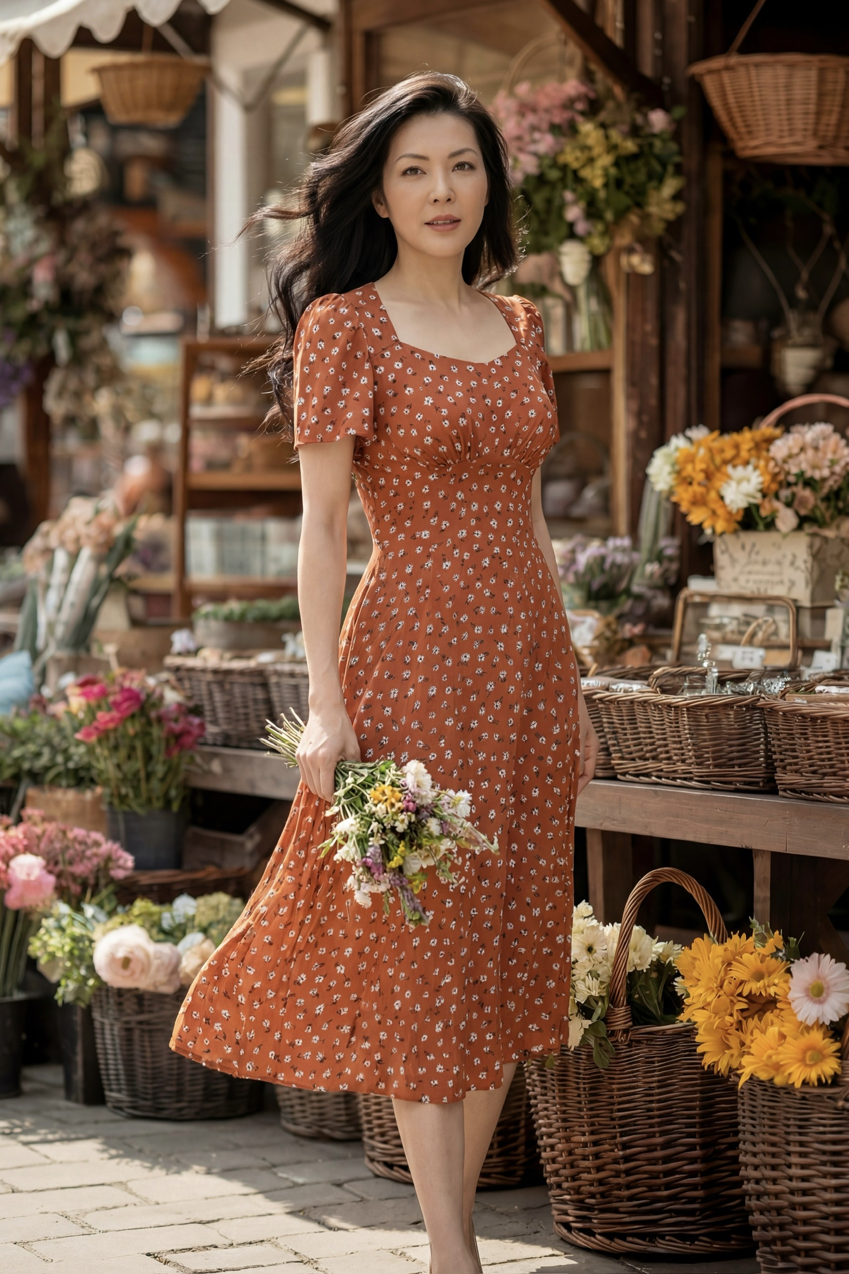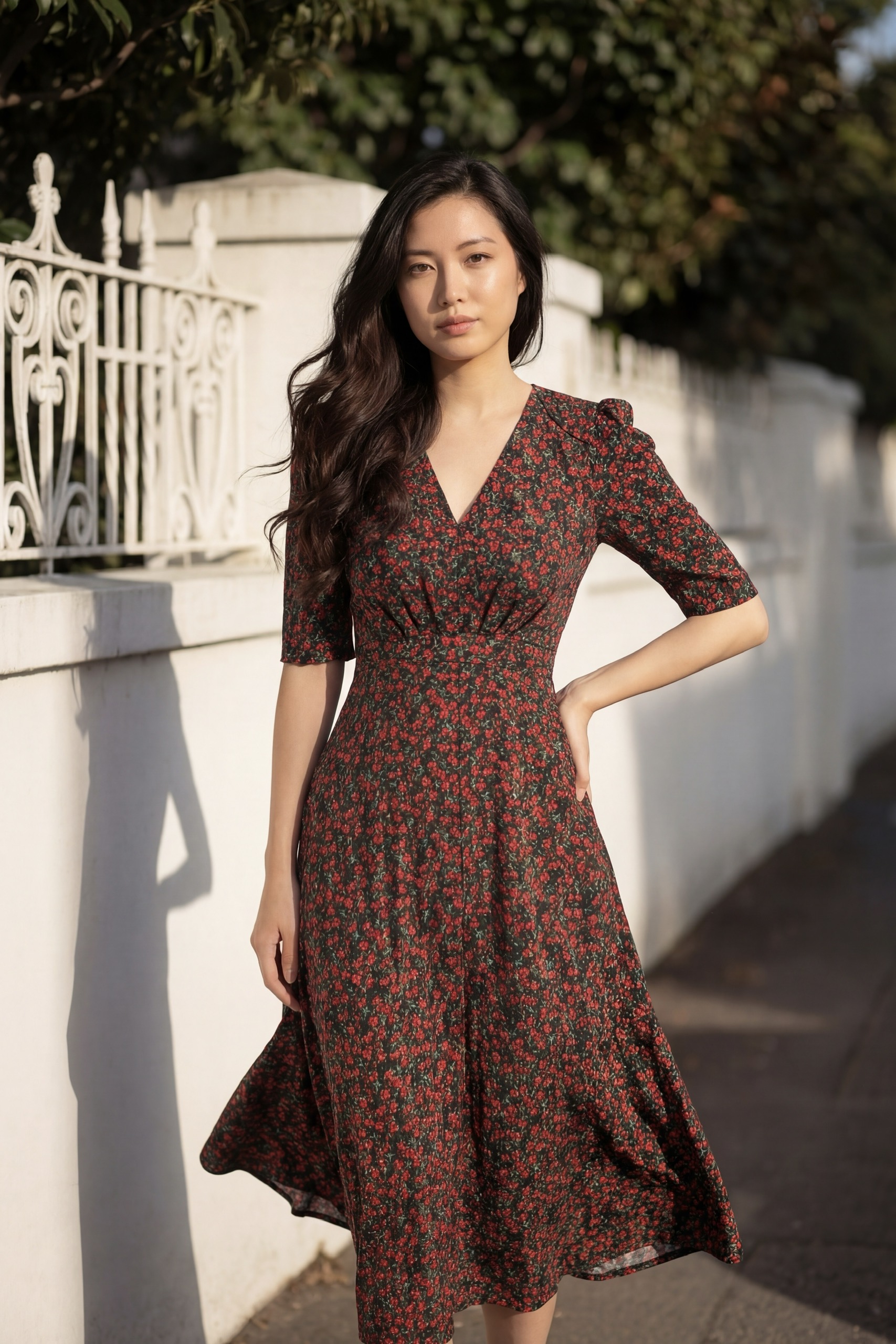 Đầm Midi dáng dài cổ tim, vai chồm, eo cao, lưng có thun, tùng A.