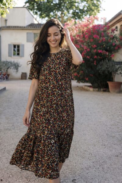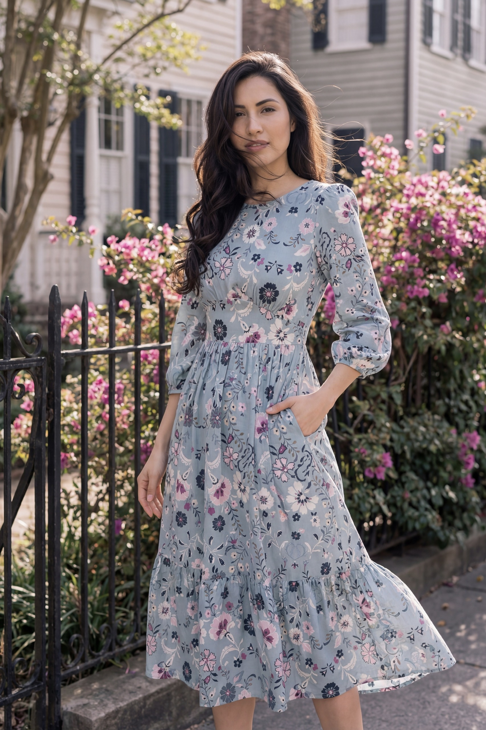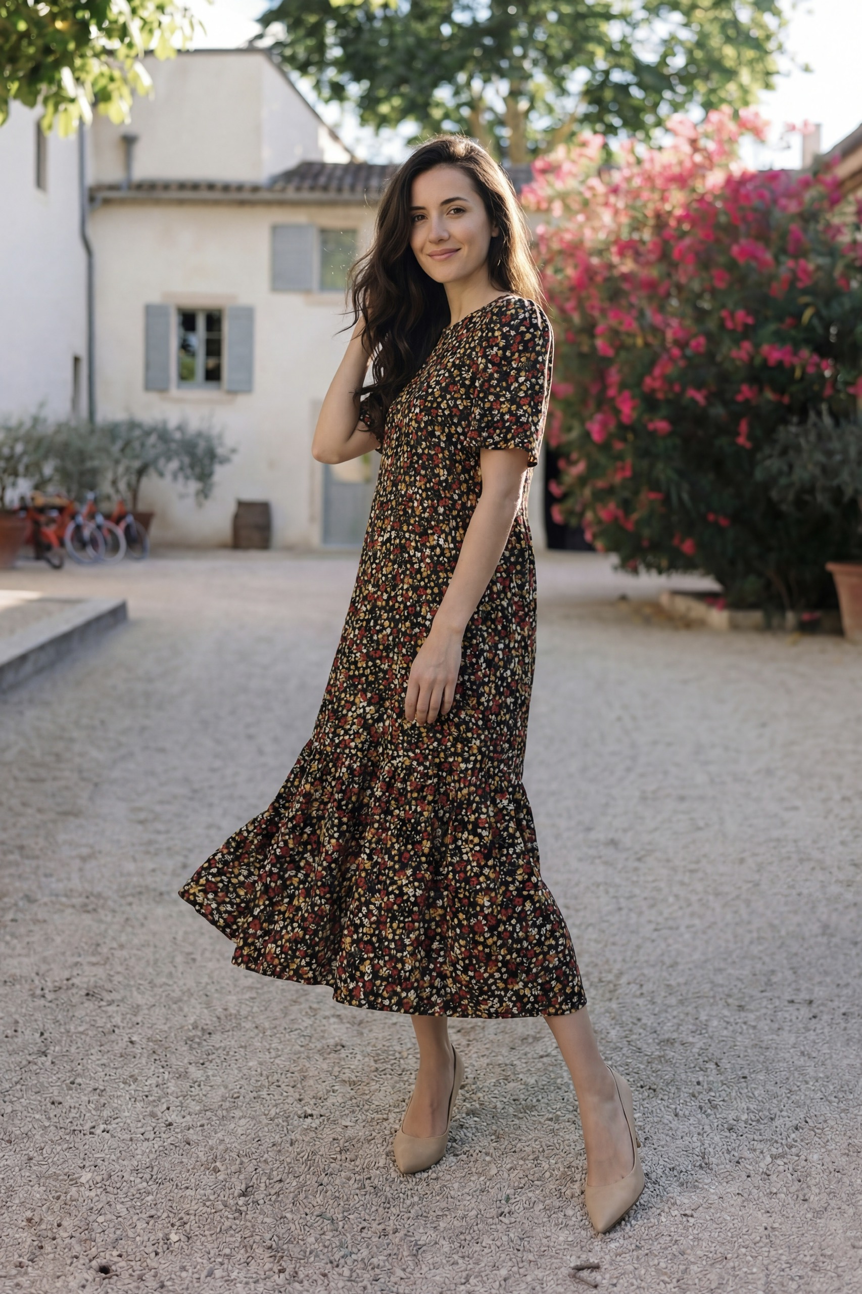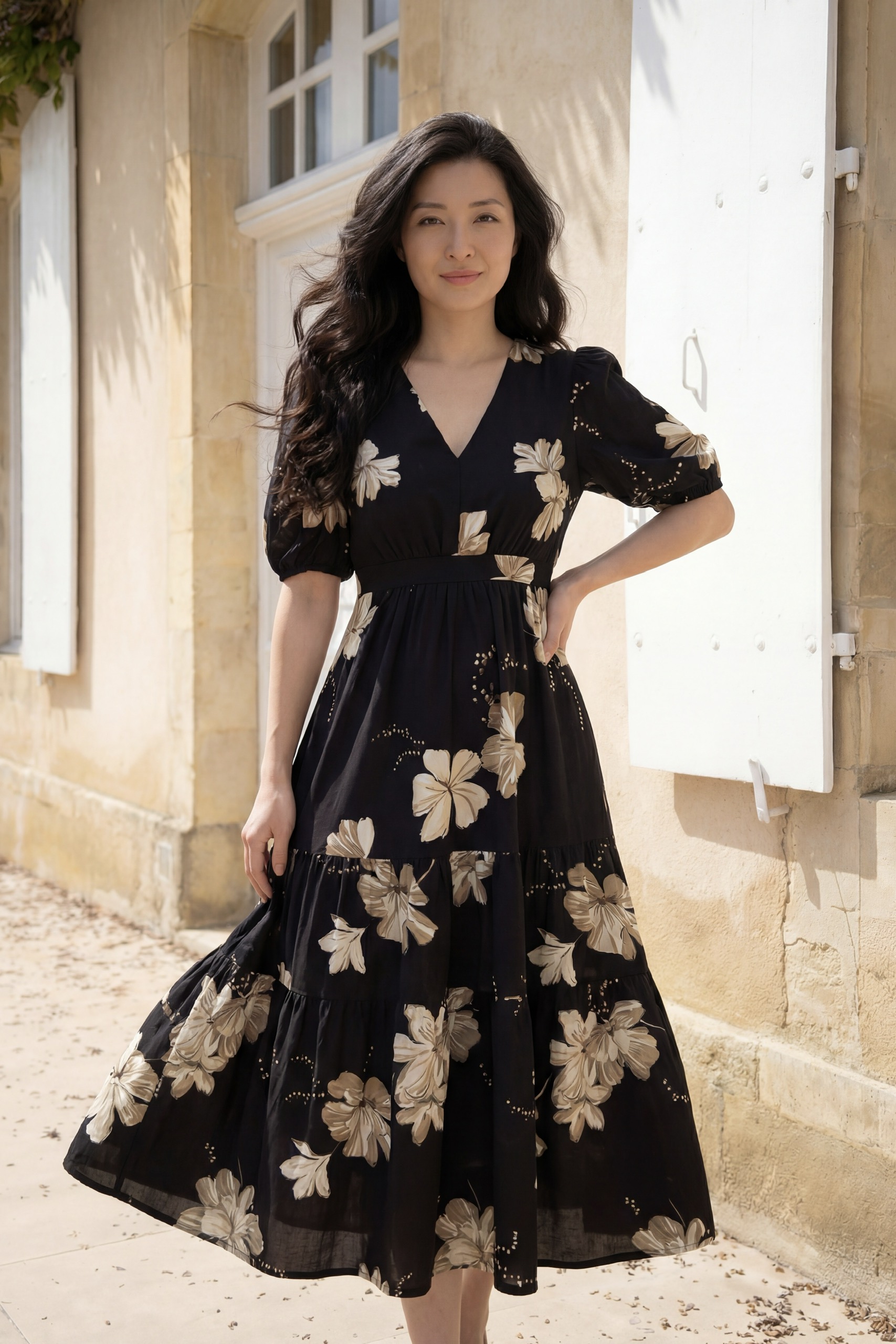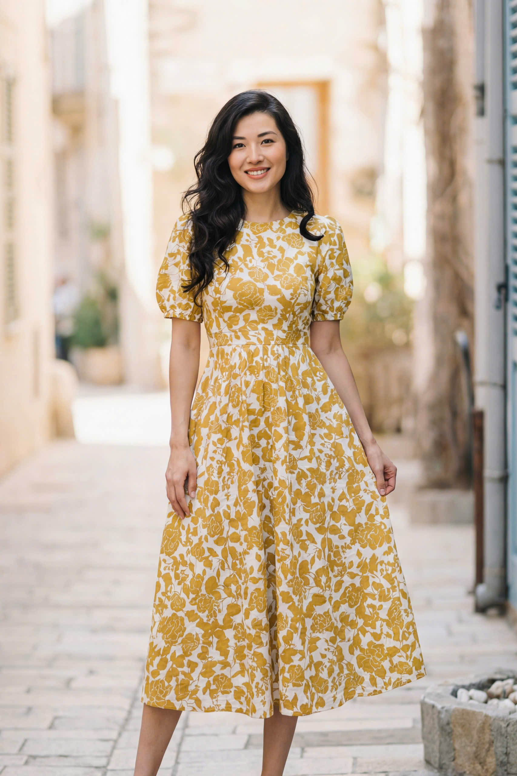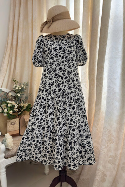 Đầm Midi cổ tròn tay phồng phối tầng, dáng suông, có túi hông.