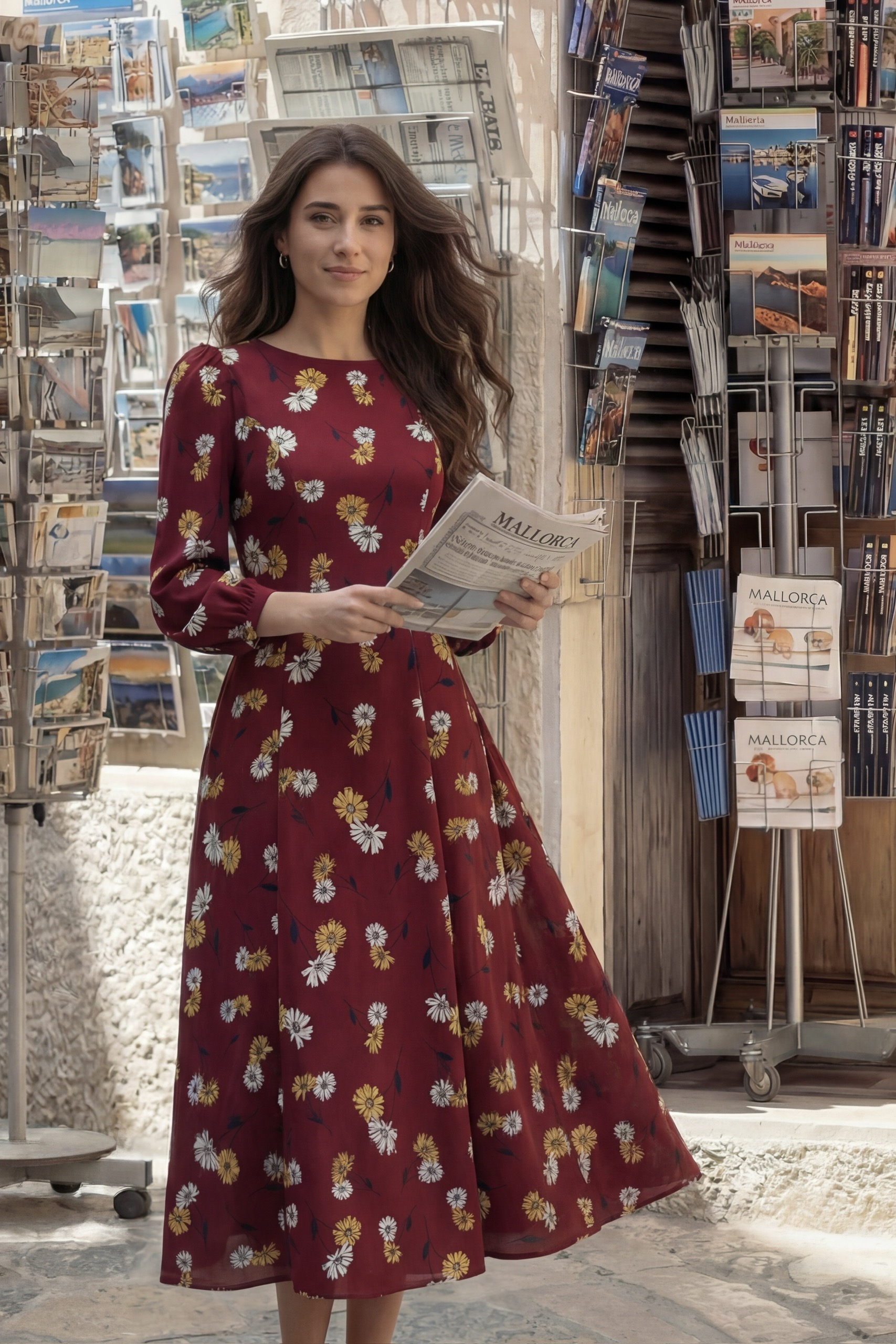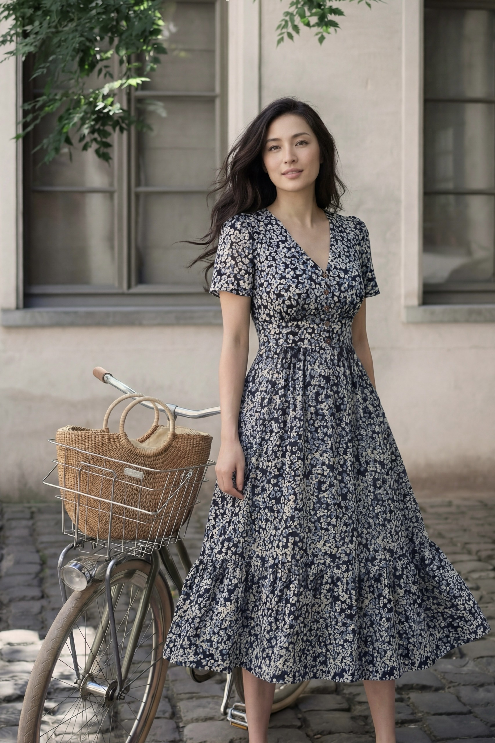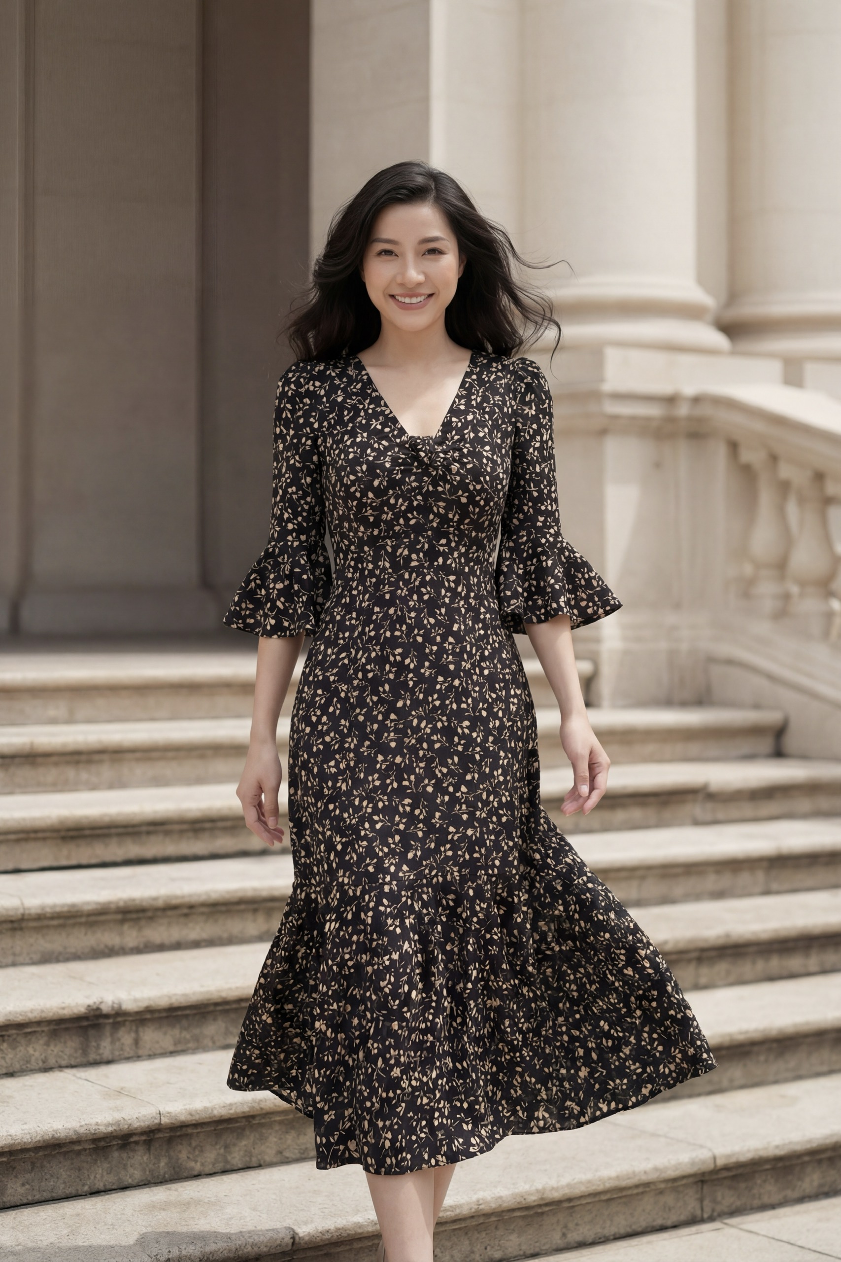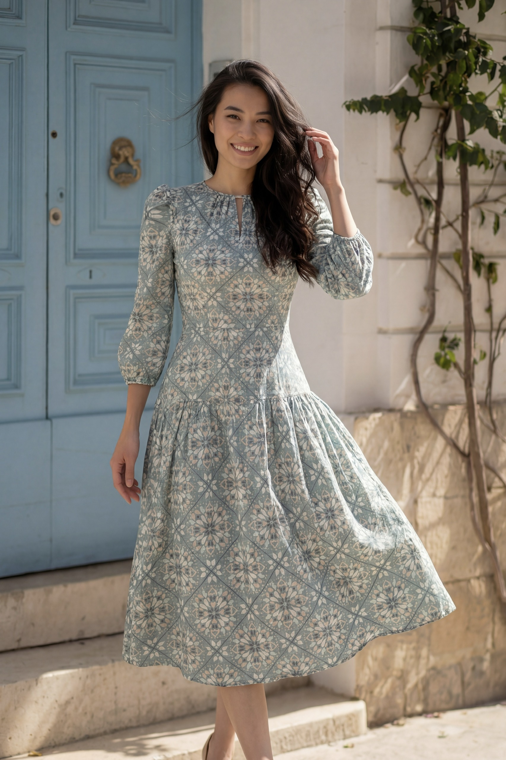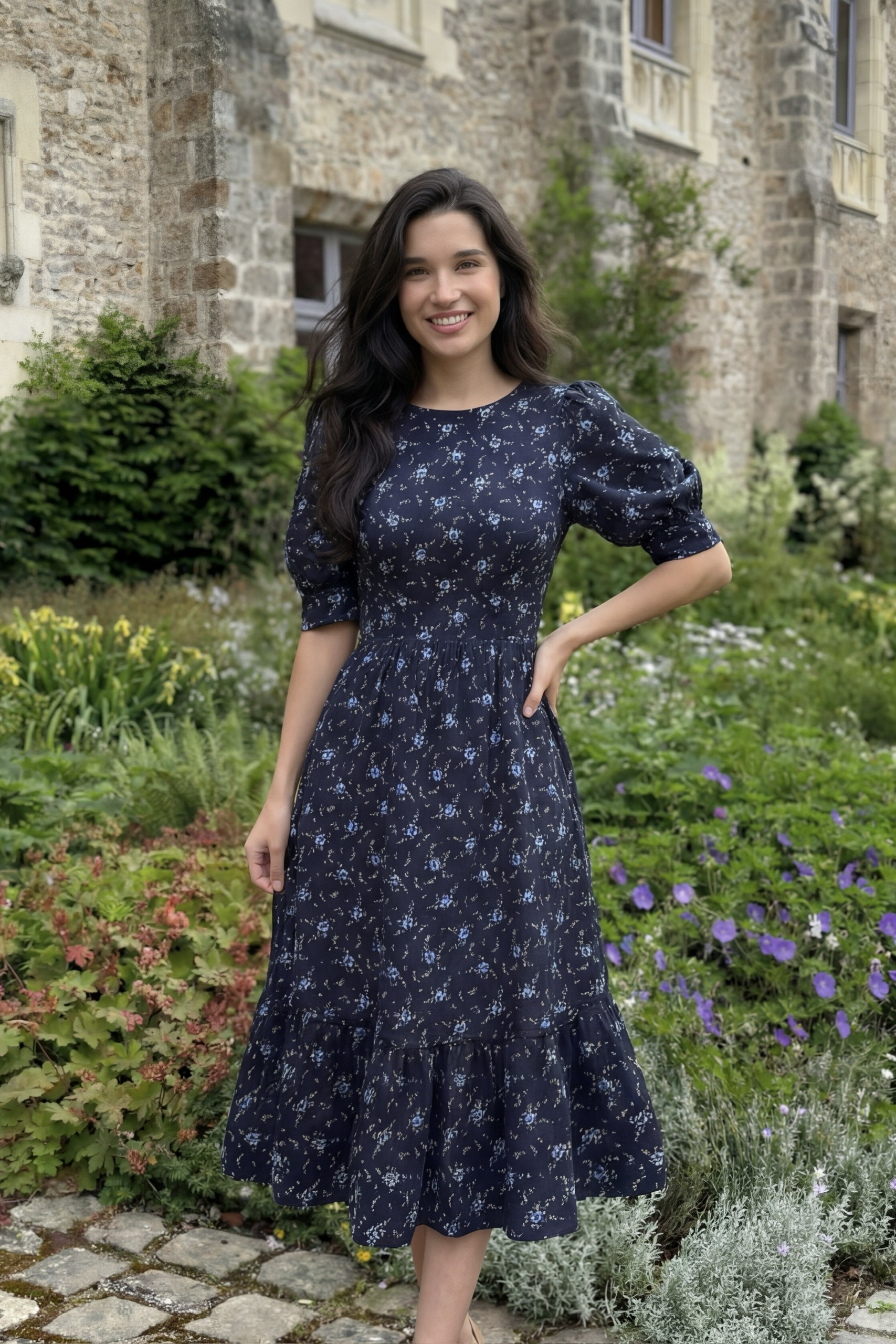 Đầm Midi cổ tròn tay phồng phối tầng, dáng suông, có túi hông.
