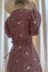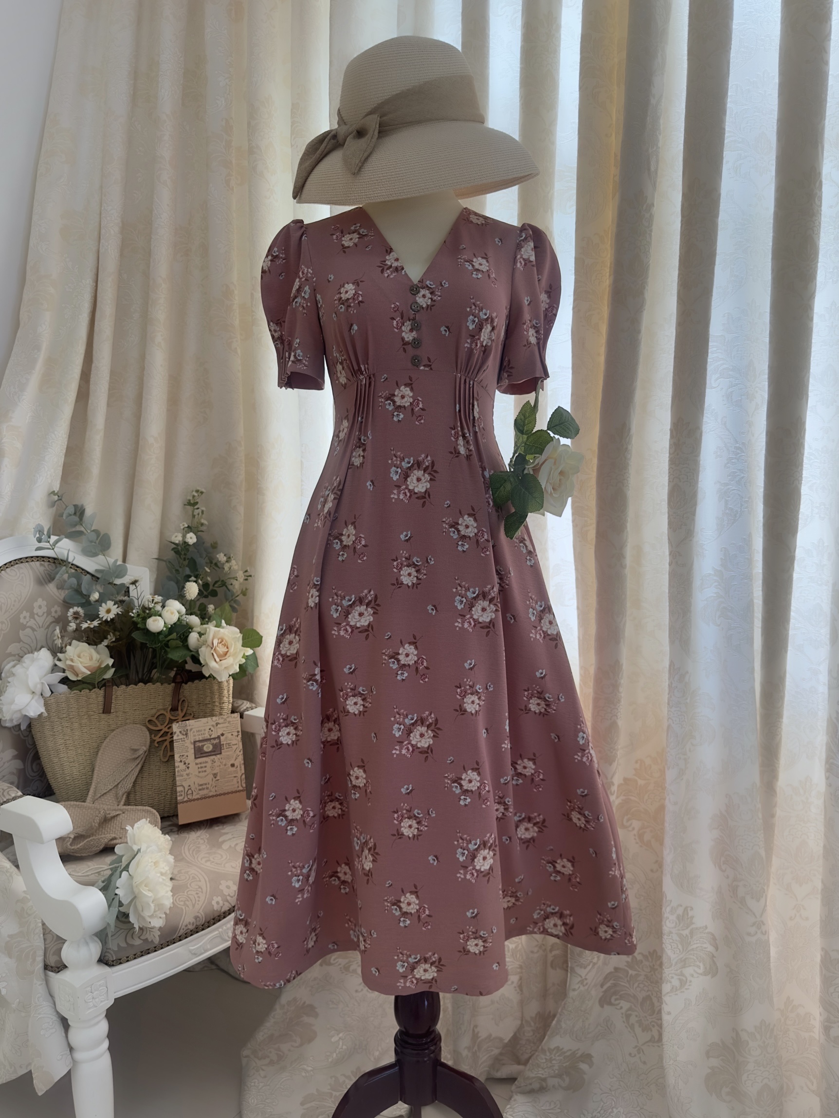 Đầm Midi cổ tim tay phồng xếp pli ngực eo thun