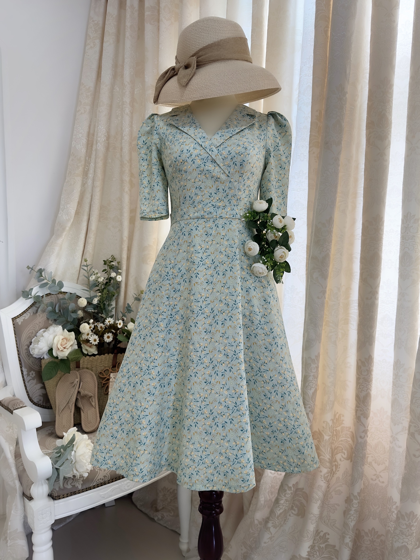 Đầm cổ sam phối nẹp eo tùng 8 mảnh.