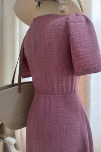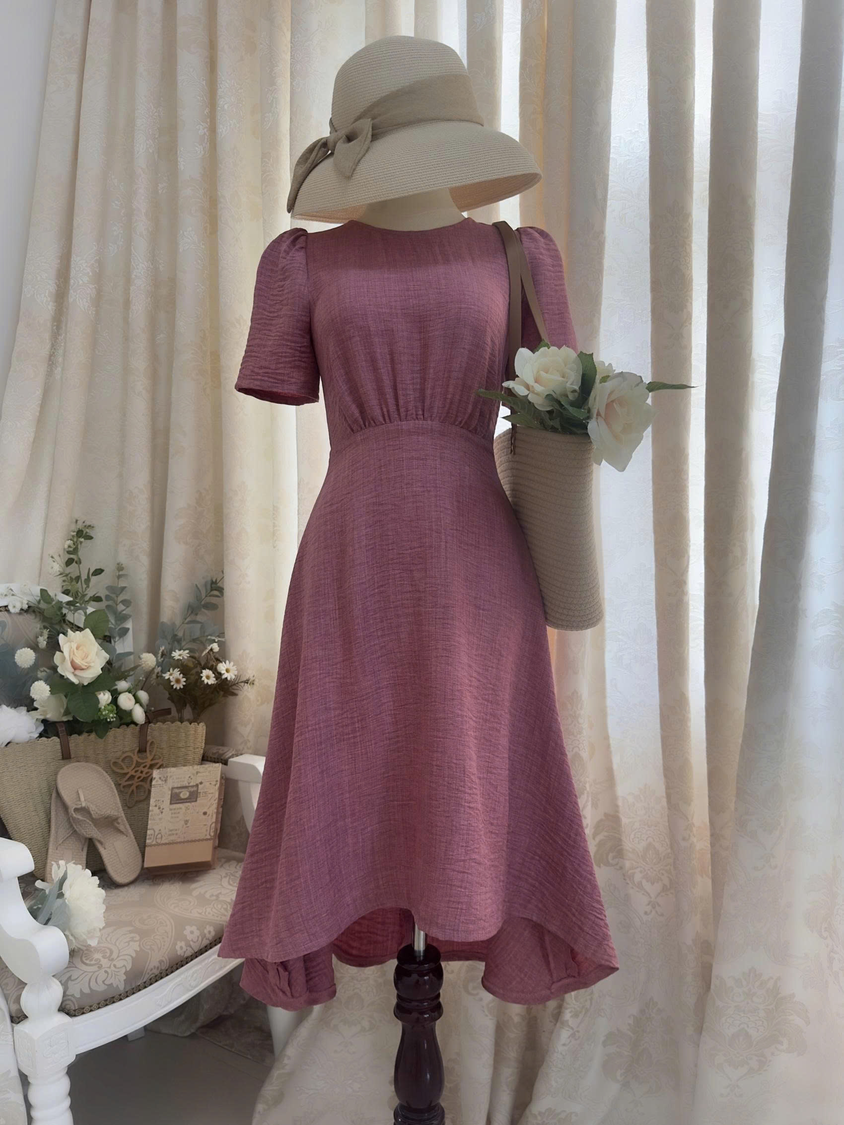 Đầm cổ tròn tay loe, phối eo cao dún thun tùng đuôi cá.