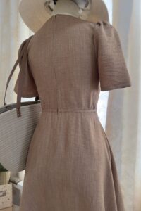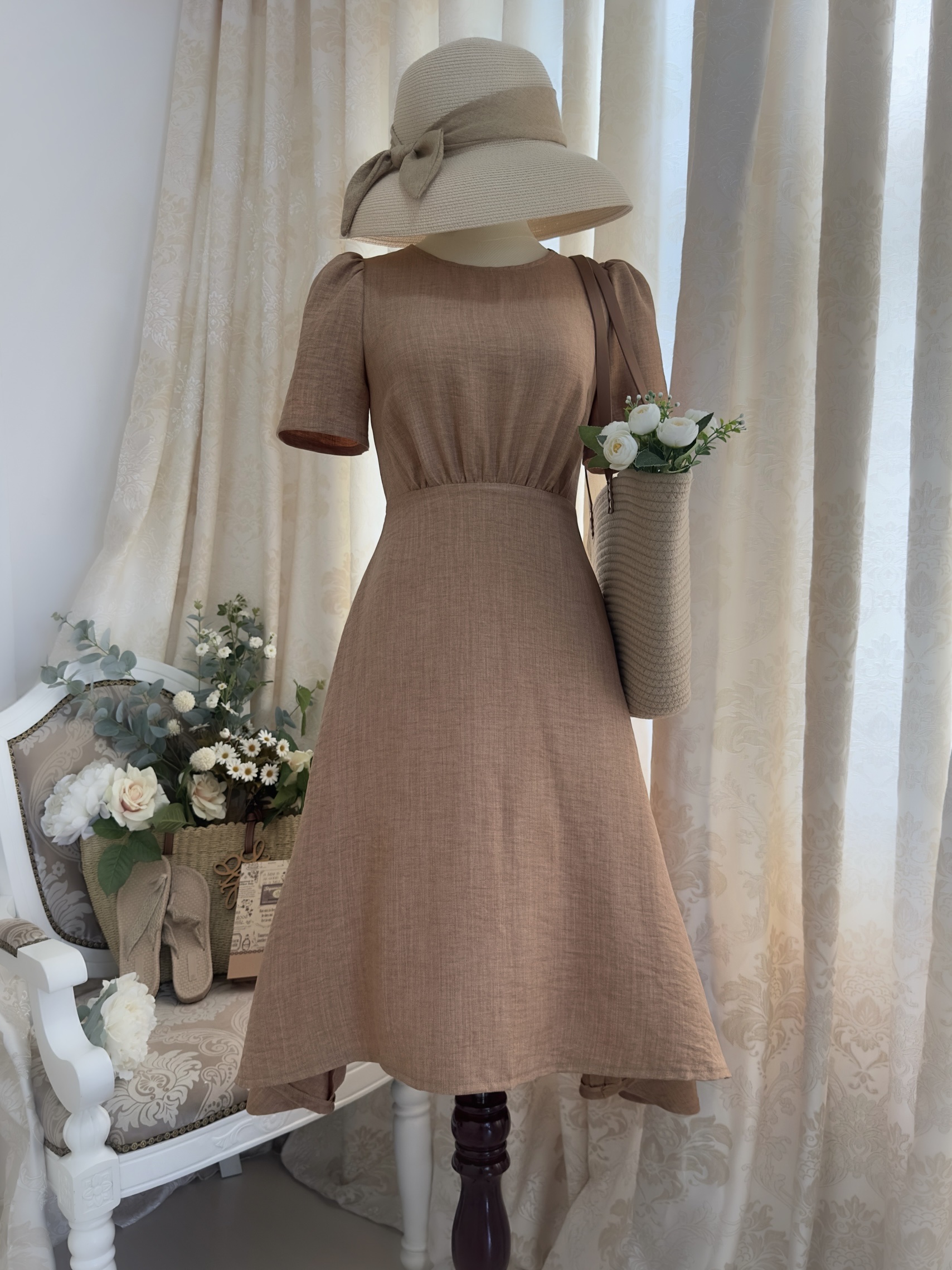 Đầm cổ tròn tay loe, phối eo cao dún thun tùng đuôi cá.