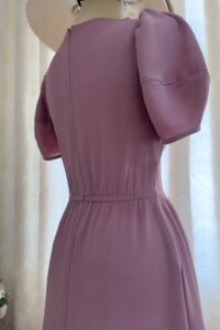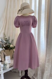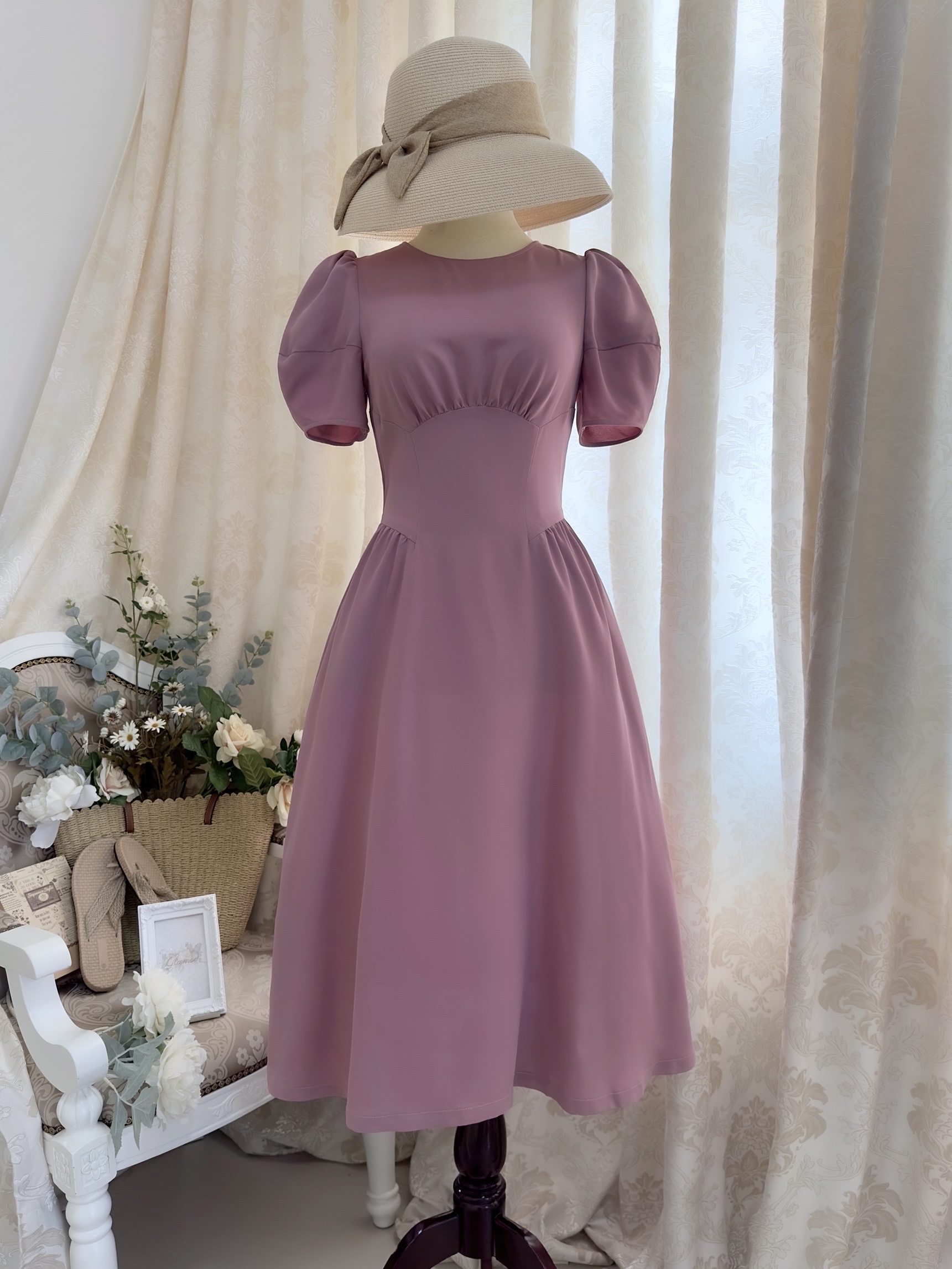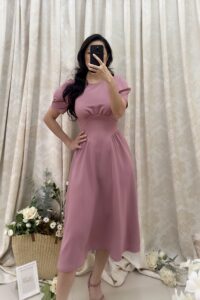 Đầm Midi cổ tròn tay phồng, dún ngực, eo sau dún thun.