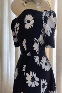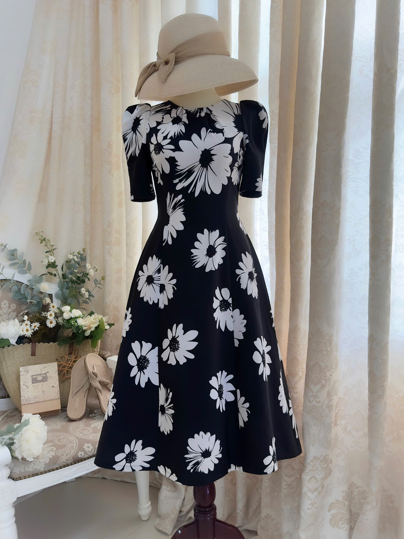 Đầm midi cổ tròn xếp pli, tay phồng, tùng 8 mảnh
