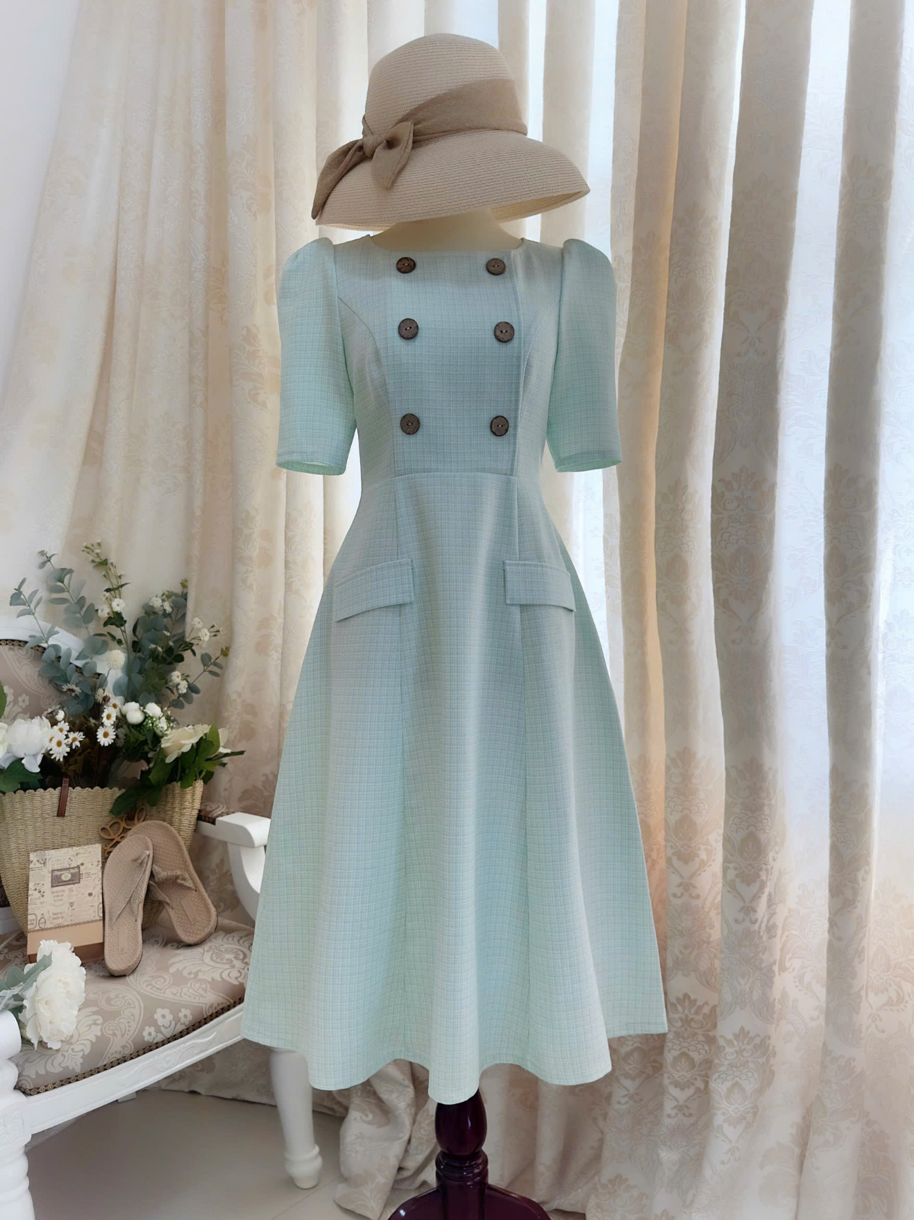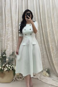 Đầm Midi cổ U 6 nút tùng 8 mảnh