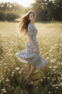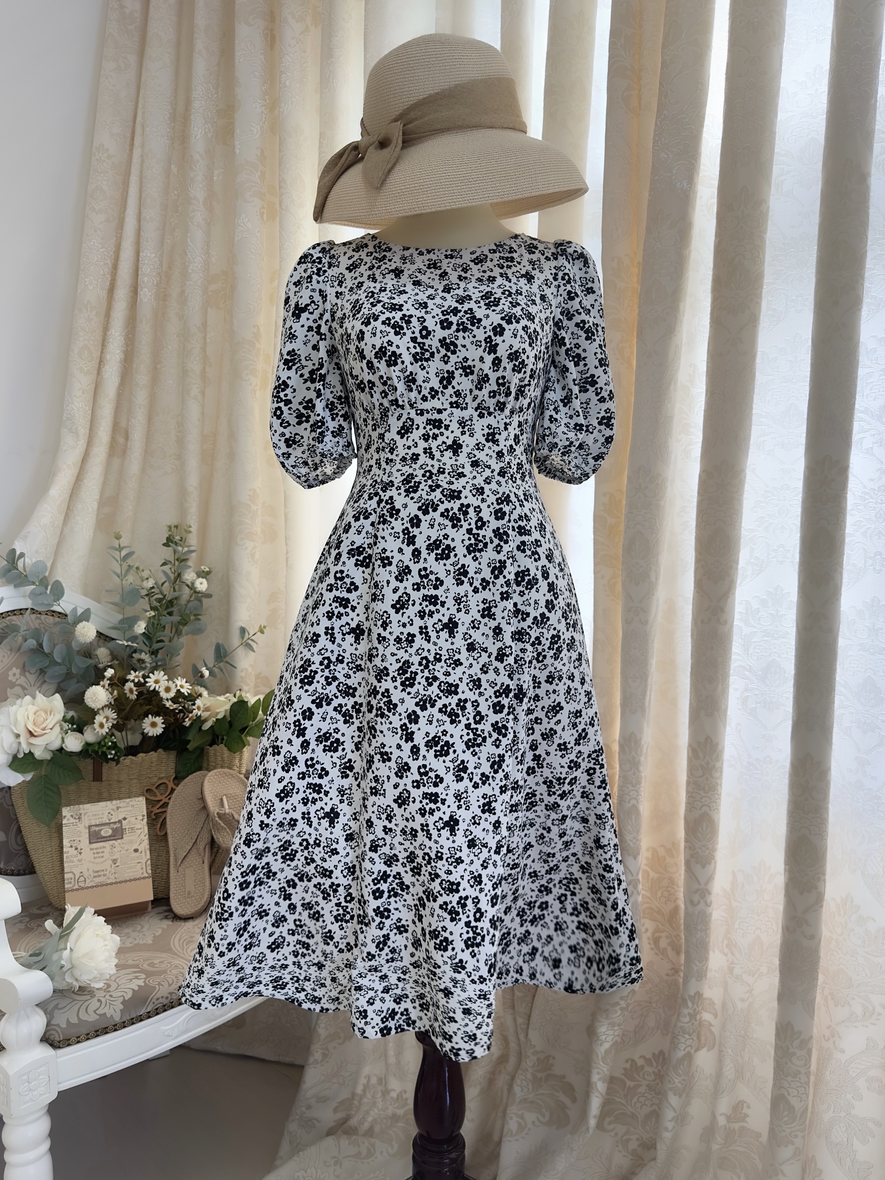 Đầm Midi cổ thuyền tay phồng nối chân ngực eo thun tùng 8 mảnh.
