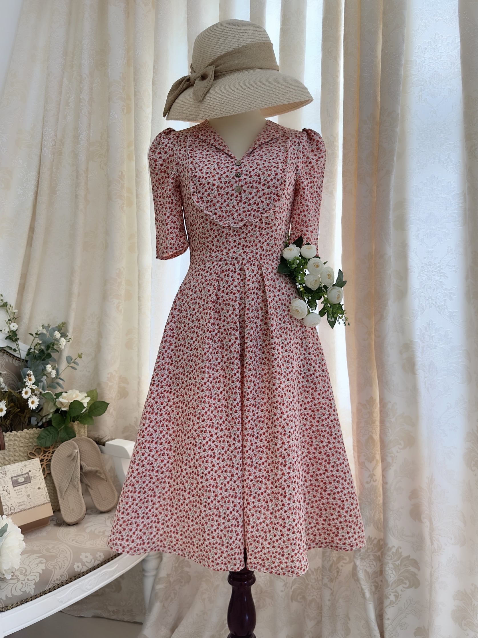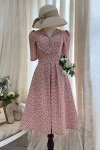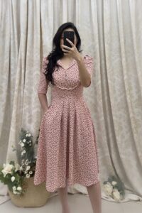 Đầm cổ lật phối bèo ngực, eo thun sau, tùng xếp pli, túi xéo