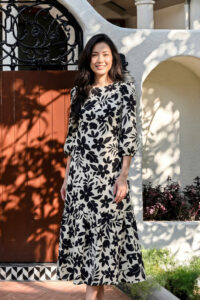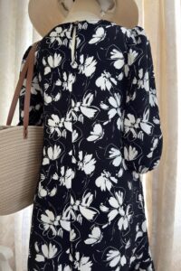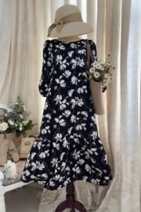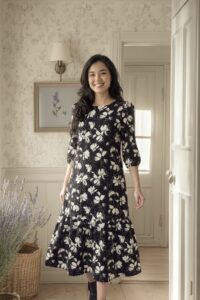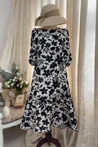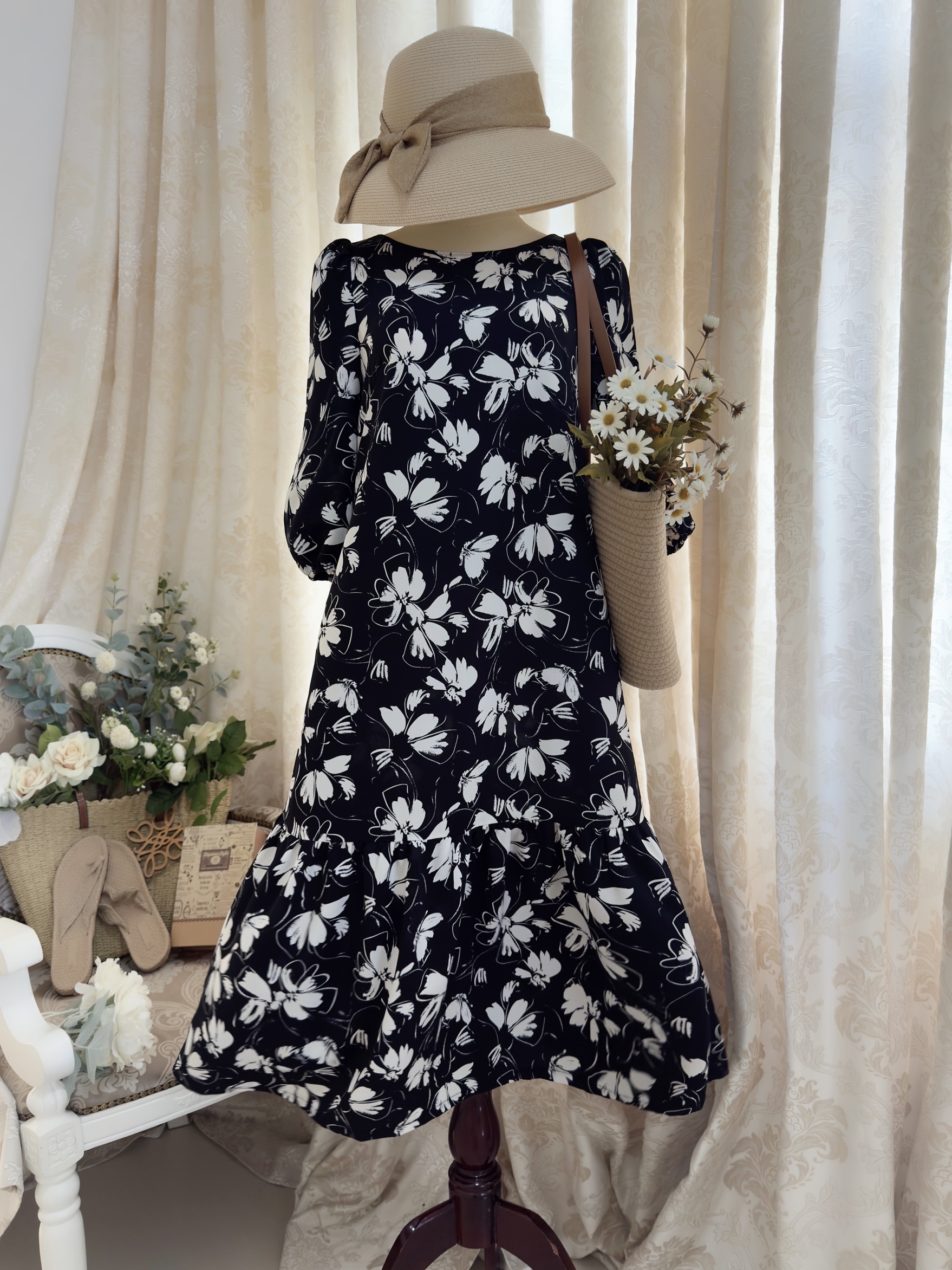 Đầm Midi cổ thuyền, tay lửng, phối bèo lai, dáng suông, có túi hông.