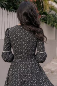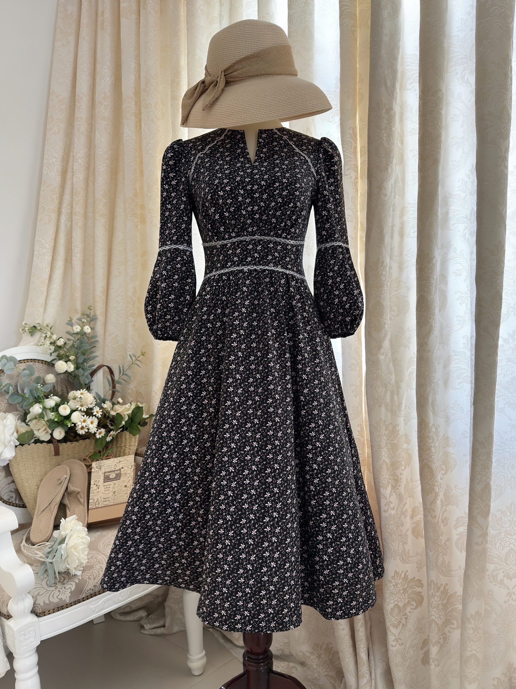 Đầm Midi cổ khóa tay lồng đèn, eo thun.