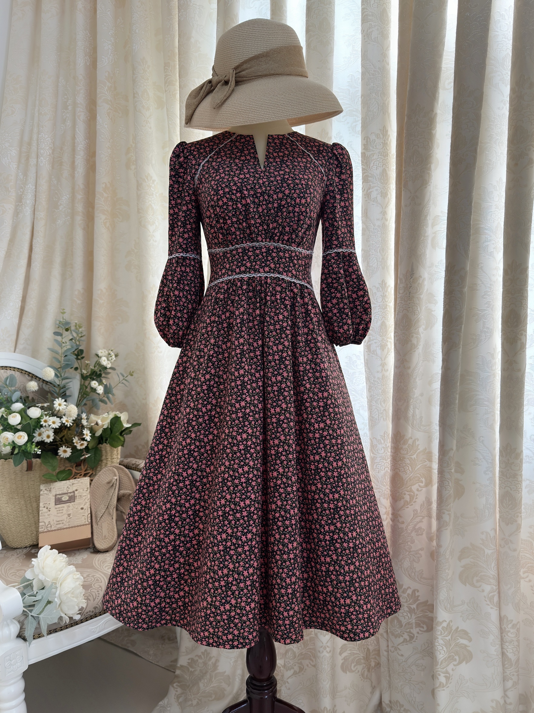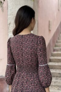 Đầm Midi cổ khóa tay lồng đèn, eo thun.
