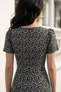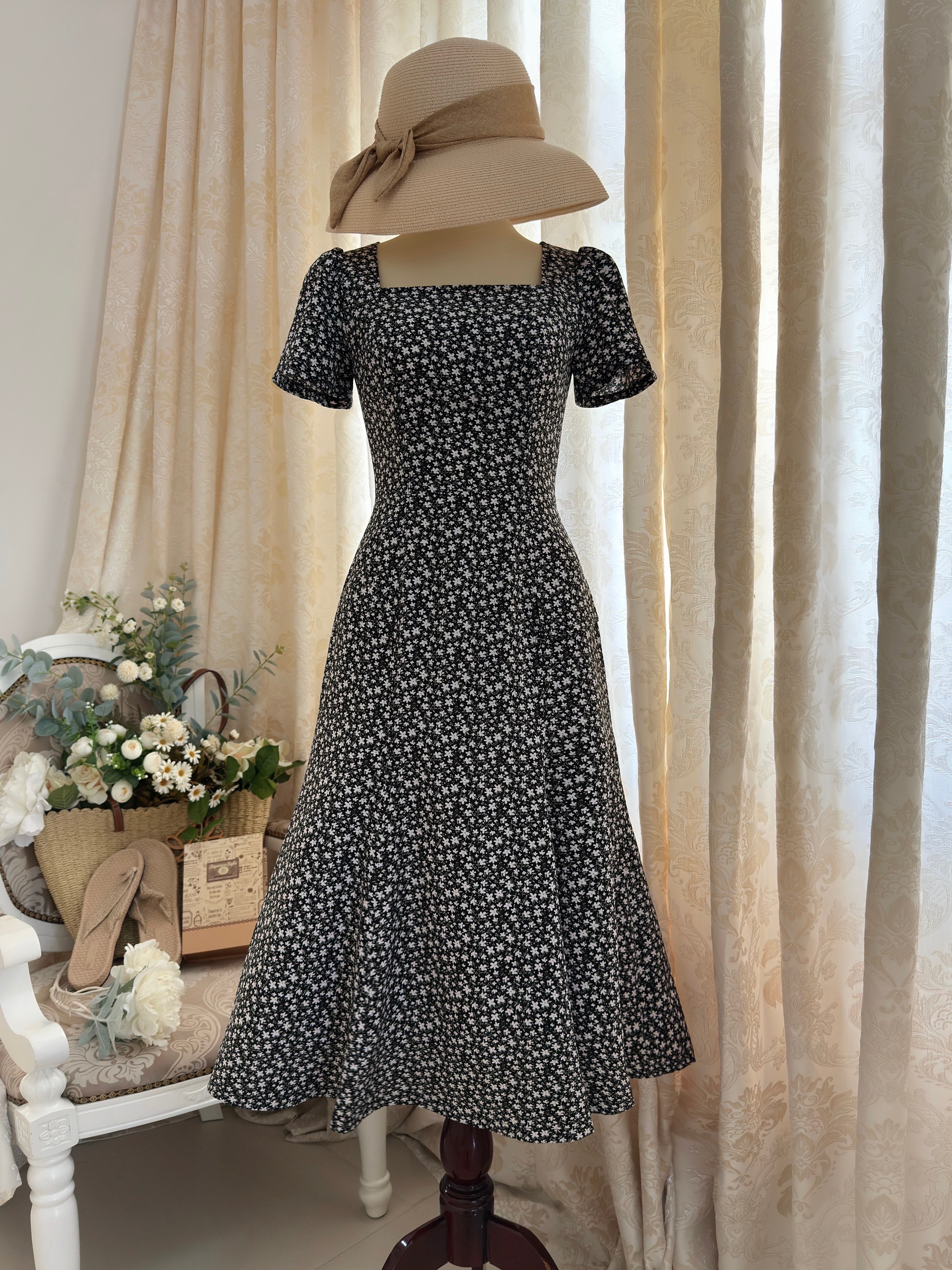 Đầm Midi cổ vuông tay loe, tùng 8 mảnh, dáng đuôi cá.