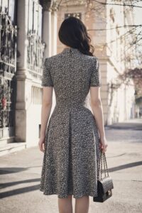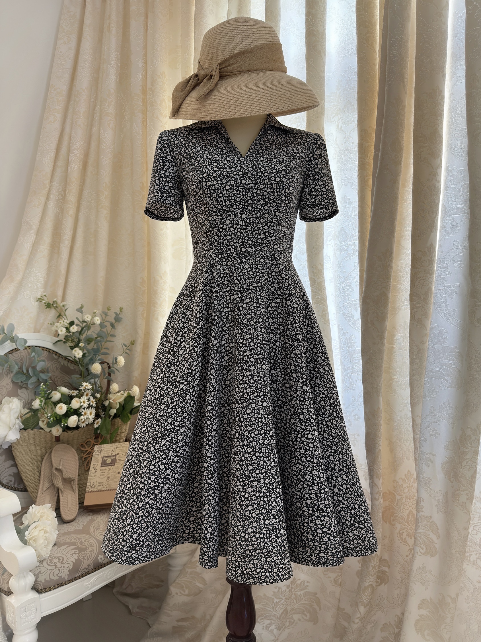Đầm cổ sơ mi không chân xẻ khóa, tay ngắn, tùng tròn.