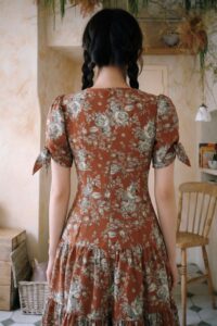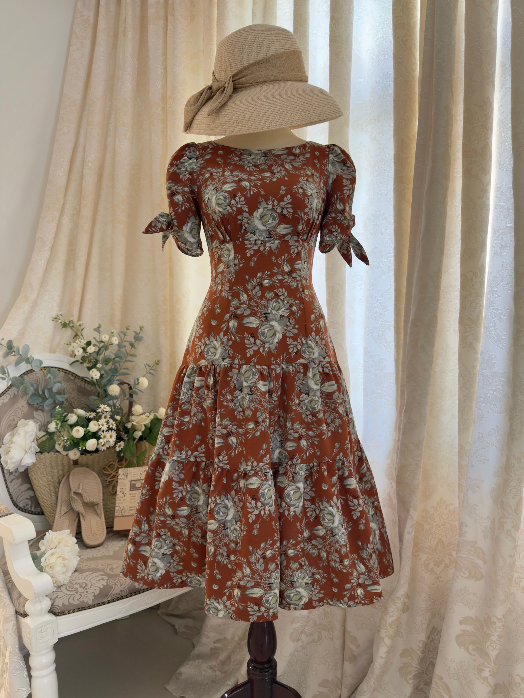 Đầm cổ thuyền nối ngực tay phồng cột nơ, tùng phối bèo.
