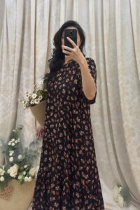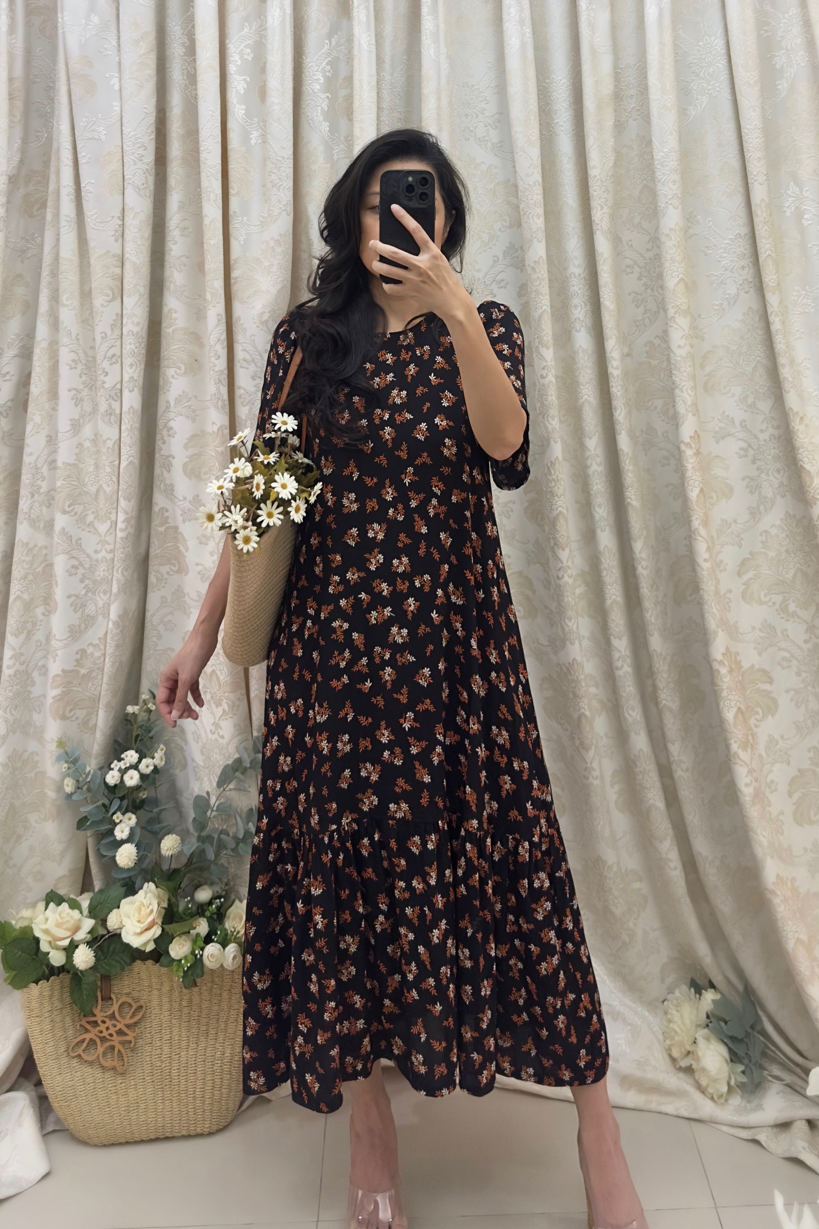 Đầm cổ tròn, tay dún, phối bèo lai, dáng suông Midi.