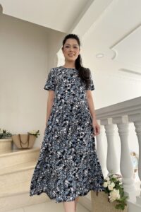 Đầm Maxi dáng rộng, cổ tròn tay ngắn tùng phối bèo