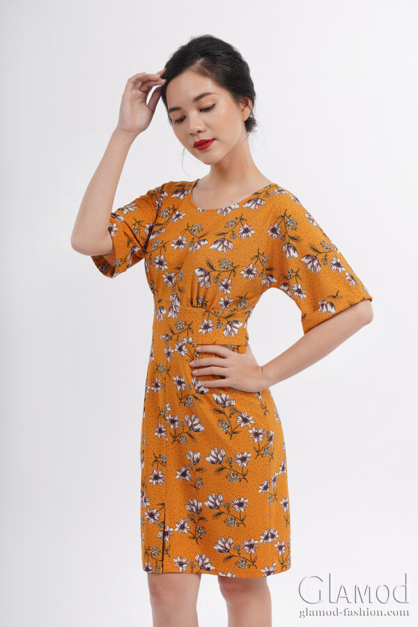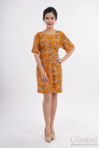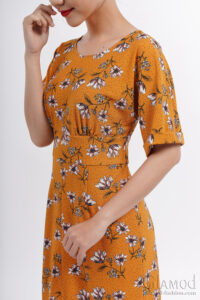 Đầm cổ tròn, tay Kimono, lưng cao dáng tùng suông, xẻ lai phía trước. Chất liệu thun 4 chiều co giãn thoải mái