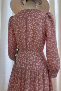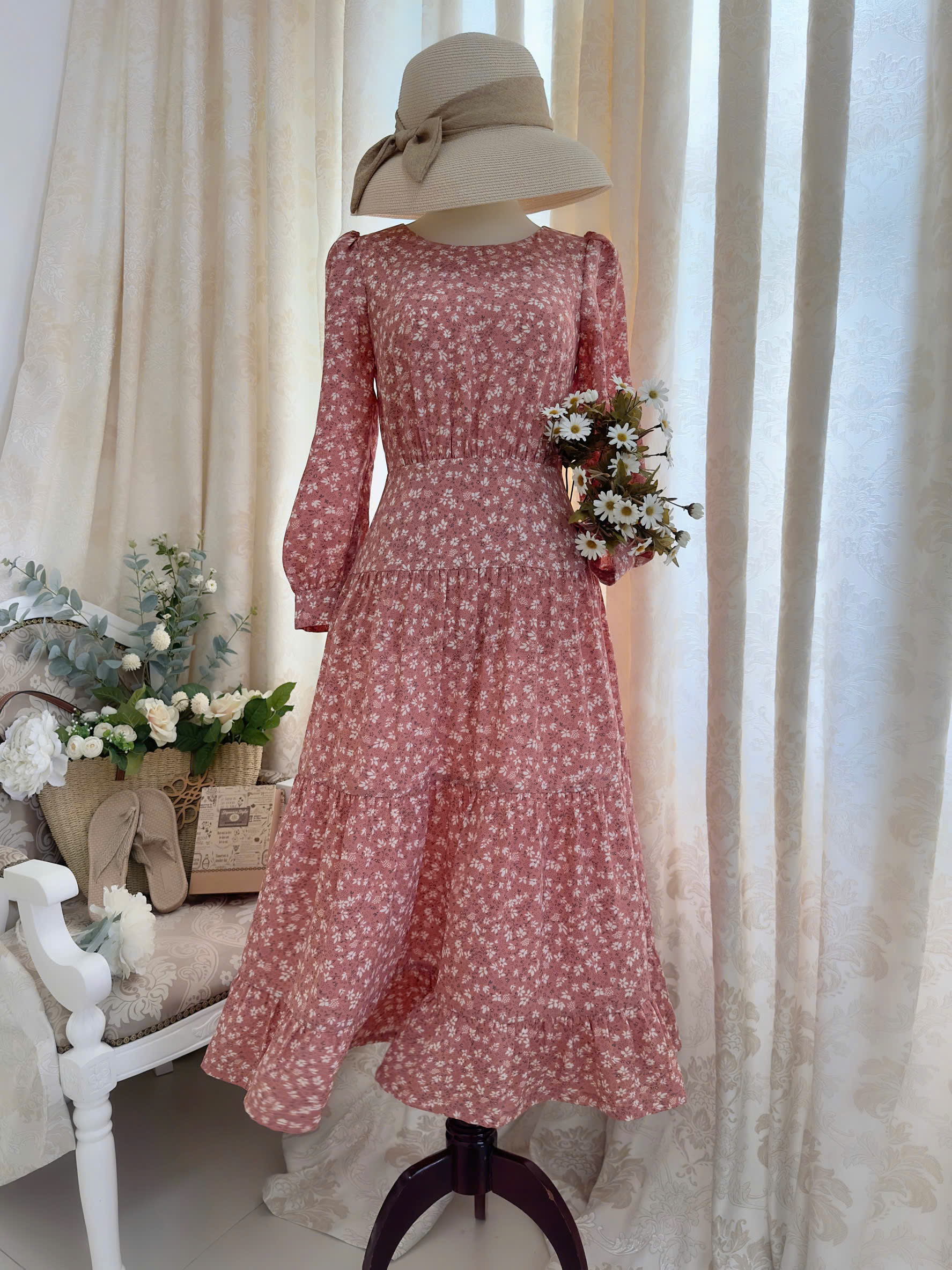 Đầm Midi dáng dài, cổ thuyền, tay phồng, phối nẹp hông, dún eo
